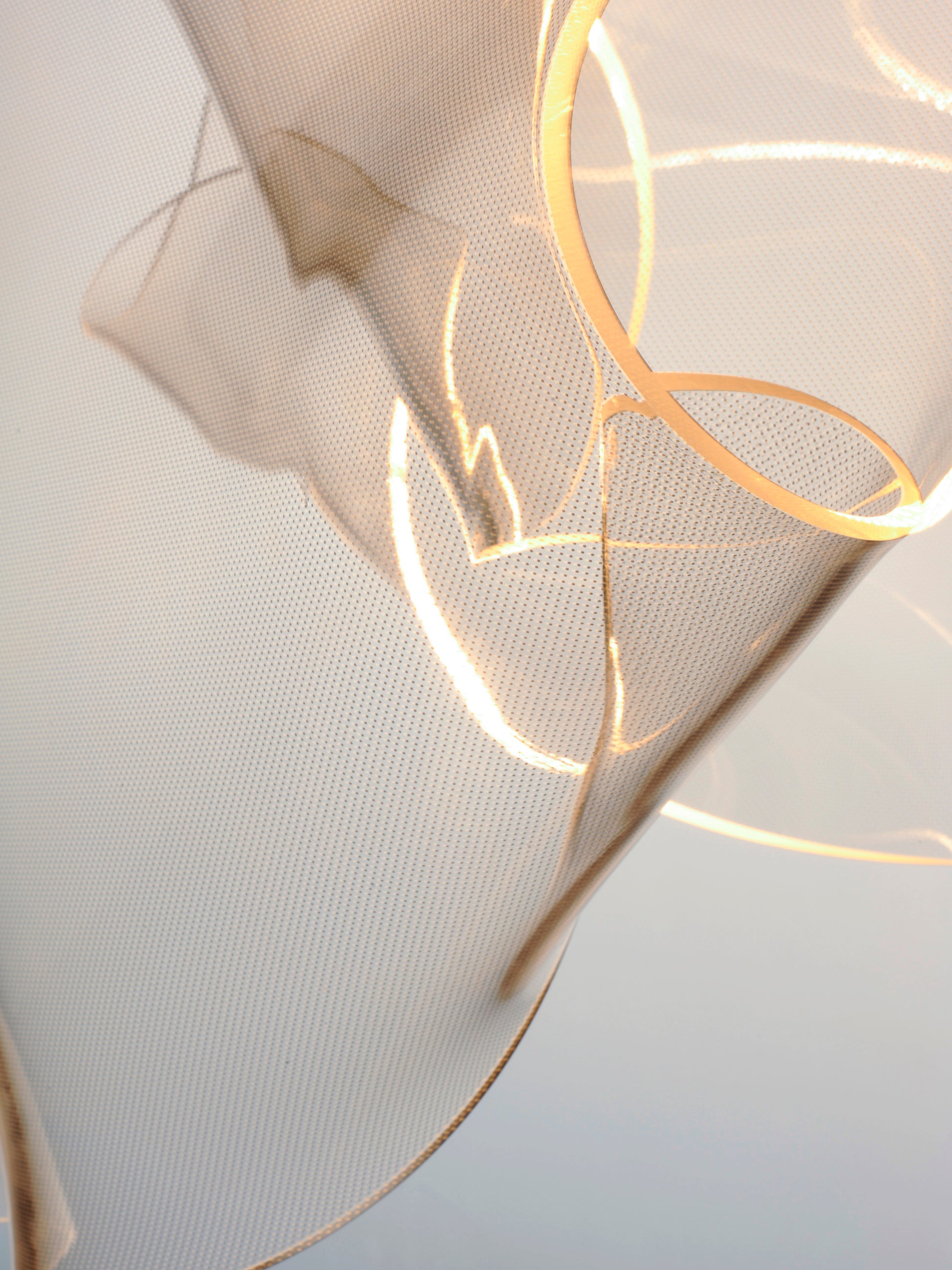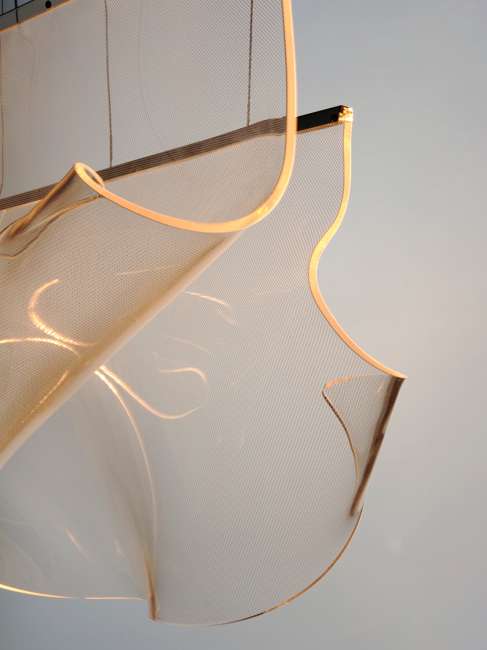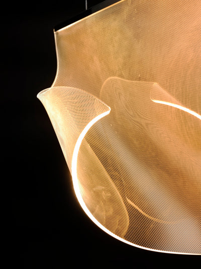 An airy arrangement of abstract forms, the Rinkle pendants feature sheets of transparent acrylic shaped by hand. The light guided acrylic captures the glow of energy efficient LEDs recessed within strips of shining stainless steel, obscuring the source of illumination. Delicately suspended by a series of thin wires, the pendants appear to be floating in an adjustable configuration of weightless light sculpture. Available in Polished Chrome, French Gold, and Brushed Gunmetal, its unique design adds a showstopping element to interior spaces.