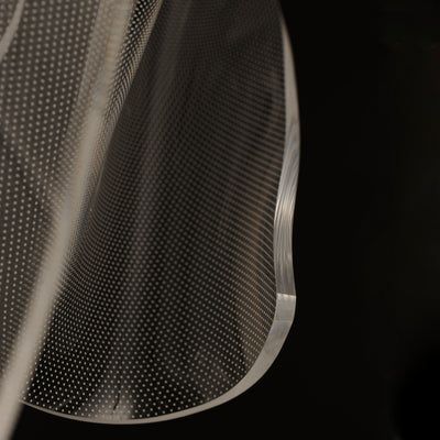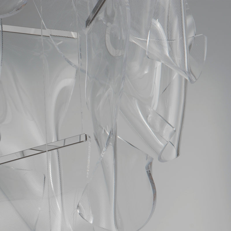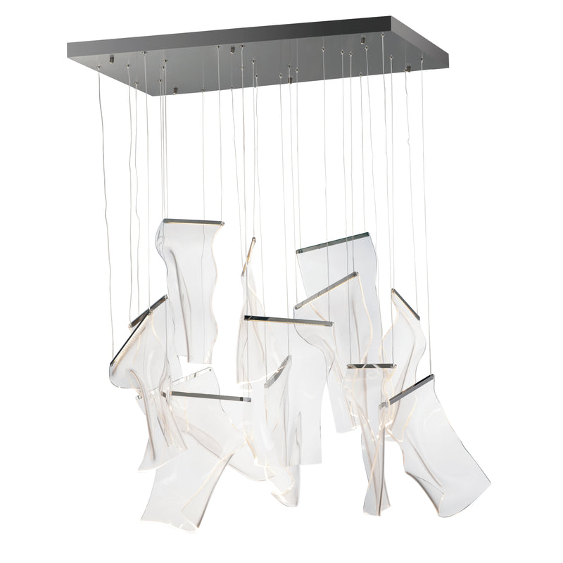 An airy arrangement of abstract forms, the Rinkle pendants feature sheets of transparent acrylic shaped by hand. The light guided acrylic captures the glow of energy efficient LEDs recessed within strips of shining stainless steel, obscuring the source of illumination. Delicately suspended by a series of thin wires, the pendants appear to be floating in an adjustable configuration of weightless light sculpture. Available in Polished Chrome, French Gold, and Brushed Gunmetal, its unique design adds a showstopping element to interior spaces.