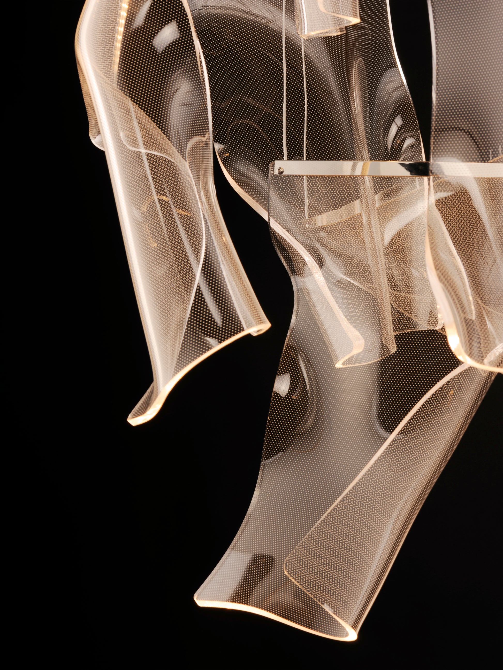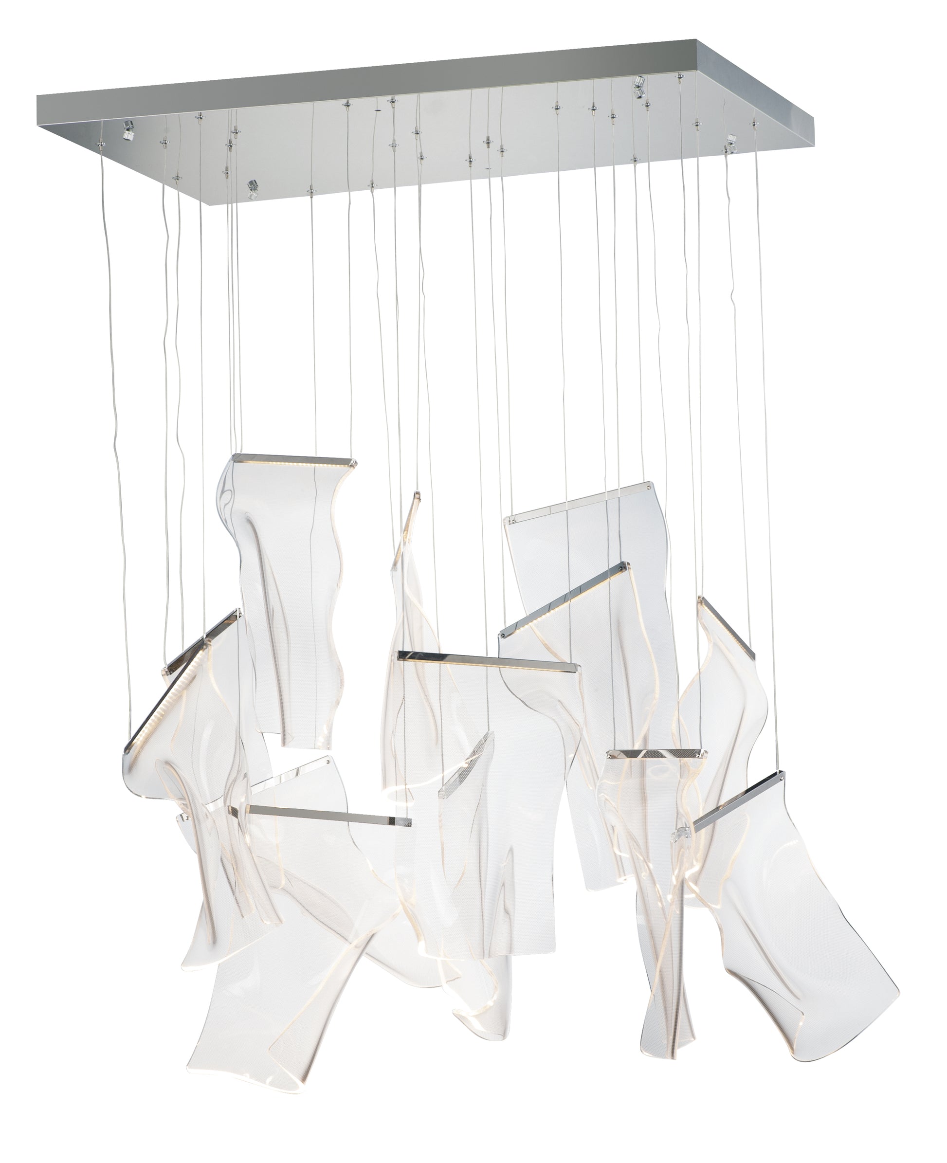 An airy arrangement of abstract forms, the Rinkle pendants feature sheets of transparent acrylic shaped by hand. The light guided acrylic captures the glow of energy efficient LEDs recessed within strips of shining stainless steel, obscuring the source of illumination. Delicately suspended by a series of thin wires, the pendants appear to be floating in an adjustable configuration of weightless light sculpture. Available in Polished Chrome, French Gold, and Brushed Gunmetal, its unique design adds a showstopping element to interior spaces.