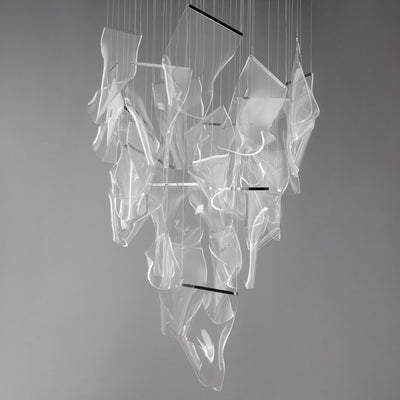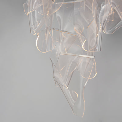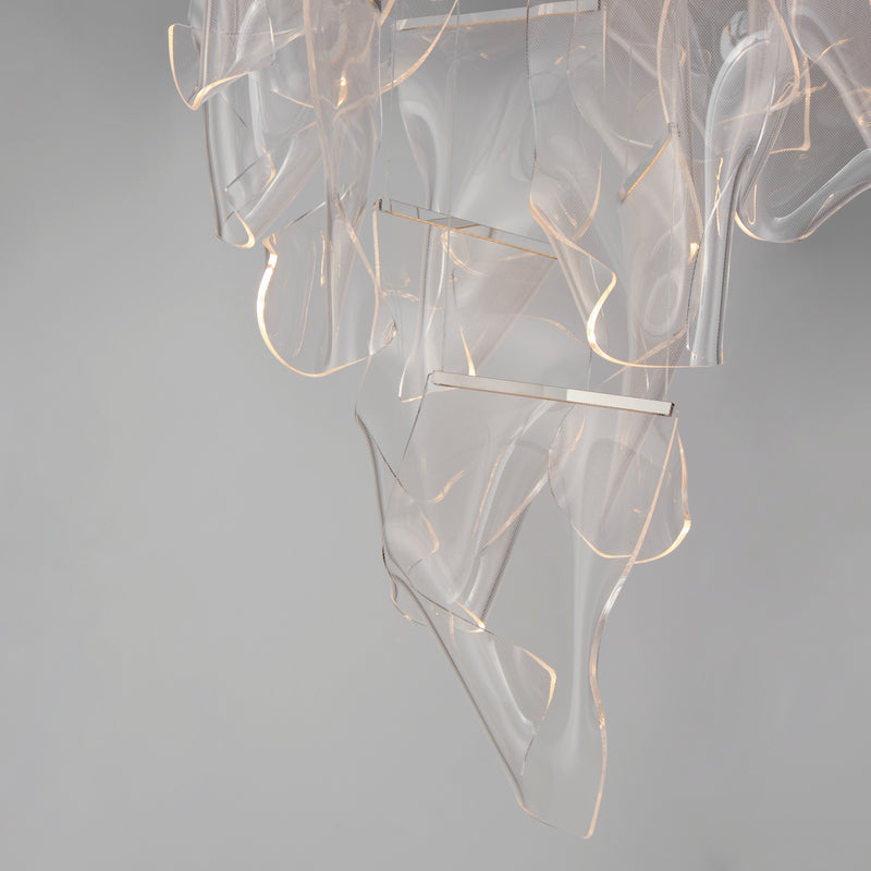 An airy arrangement of abstract forms, the Rinkle pendants feature sheets of transparent acrylic shaped by hand. The light guided acrylic captures the glow of energy efficient LEDs recessed within strips of shining stainless steel, obscuring the source of illumination. Delicately suspended by a series of thin wires, the pendants appear to be floating in an adjustable configuration of weightless light sculpture. Available in Polished Chrome, French Gold, and Brushed Gunmetal, its unique design adds a showstopping element to interior spaces.
