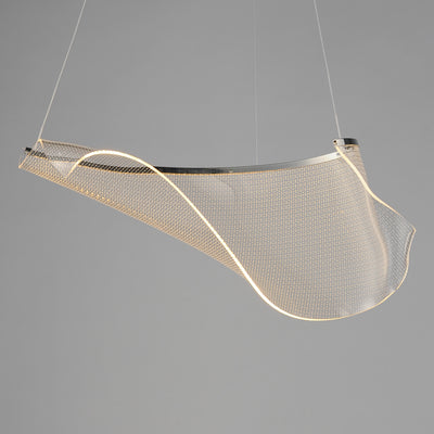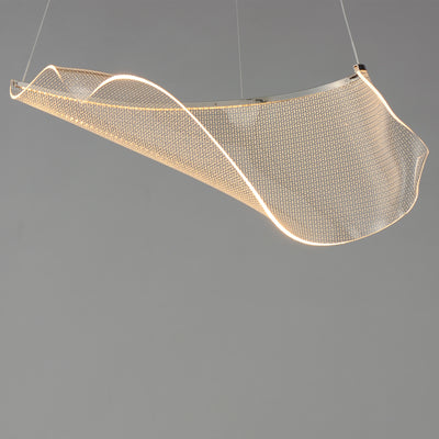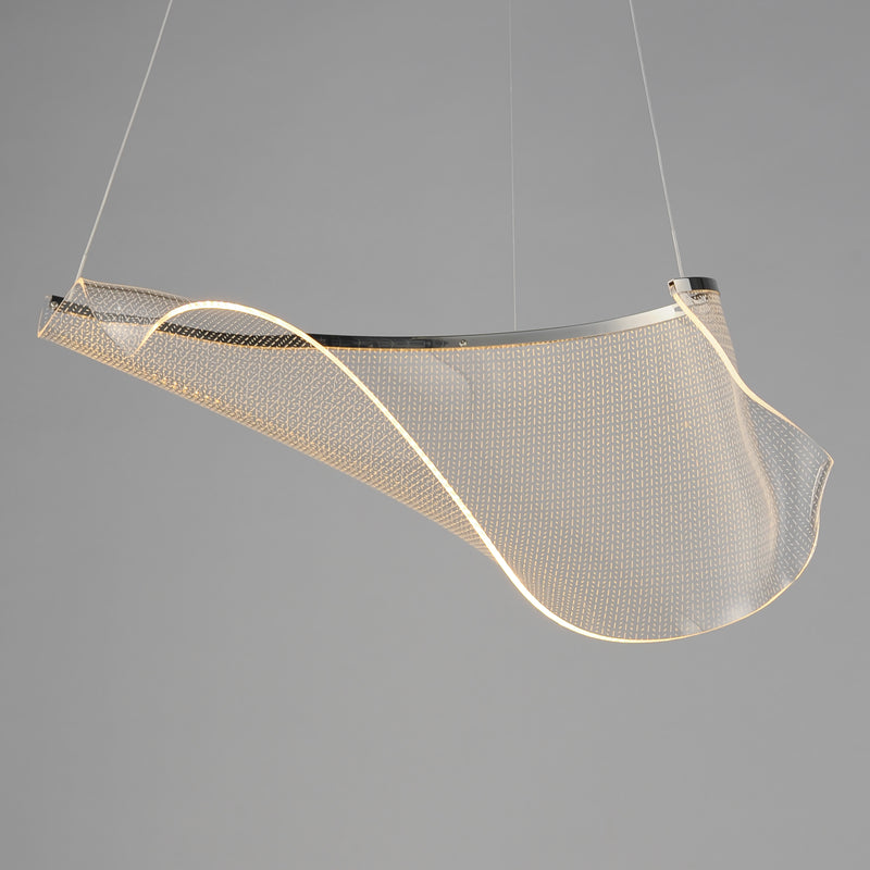 An airy arrangement of abstract forms, the Rinkle pendants feature sheets of transparent acrylic shaped by hand. The light guided acrylic captures the glow of energy efficient LEDs recessed within strips of shining stainless steel, obscuring the source of illumination. Delicately suspended by a series of thin wires, the pendants appear to be floating in an adjustable configuration of weightless light sculpture. Available in Polished Chrome, French Gold, and Brushed Gunmetal, its unique design adds a showstopping element to interior spaces.