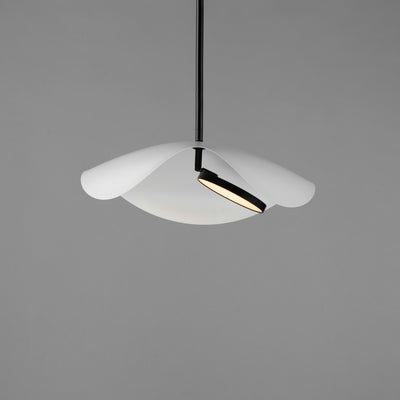 Poetic and organic in design, the undulating form of the metal shade appears to float effortlessly on a slender frame. Abstract discs of LED lighting are encased in round, adjustable heads so that the light can be directed upwards for indirect lighting reflected on the internal white painted face of the shade or the light sources can be rotated downward to provide bright illumination exactly where needed. The simple, sculptural form adds dimension in its scale evocative of a manta ray or the seductive quality of a woman wearing a large floppy hat.