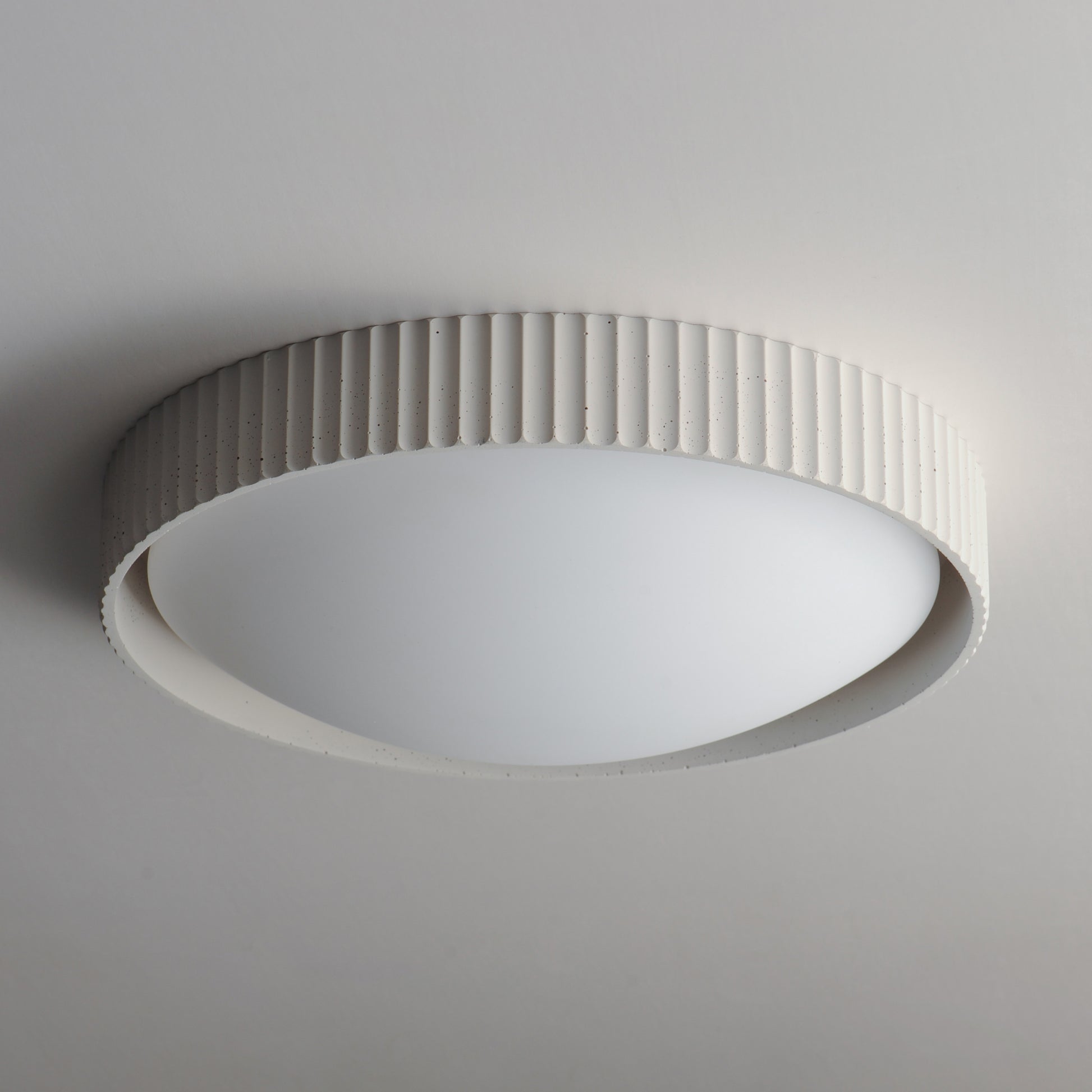 Deep pans of cast concrete in a traditional scalloped edge house LED integrated light sources behind curved opal white acrylic diffusers. Reminisce in the classical forms that benefits from the organic texture of cast concrete to add character to the design. Inspired by ramekins, these delectable LED treats are available in Chalk White, Terra Cotta, and Grey.