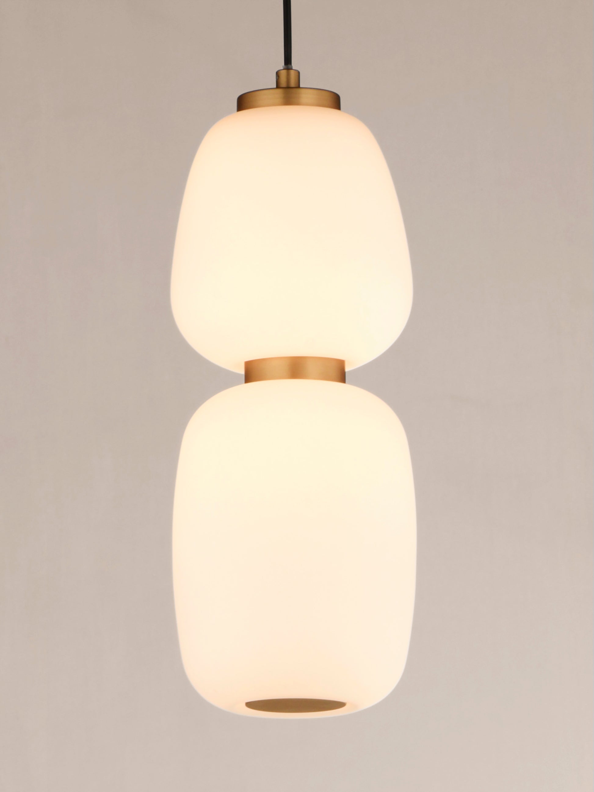 Inspired by Japanese lanterns, this soft contemporary collection features Satin White glass shades of various shapes and sizes mounted on metal frames finished in a dramatic two-tone Gold with Black accents.