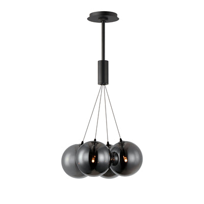 Clusters of glass globes in various sizes and color are suspended from a central point and burst outward. Configurations include a 4-Light, 9-Light, and 12-Light cluster and can be mounted close to the ceiling or included down rods to extend the height. Choose from options of Clear or Frosted glass globe clusters paired with Satin Nickel frames for an airy transitional design or be bold with Mirror Smoked glass or a varied combination of the glass including amber tinted suspended on a Matte Black frame with thin black cables. Small-scaled LED G4 lamps are included with the fixtures and centered in the glass accentuating the scale of the glass.