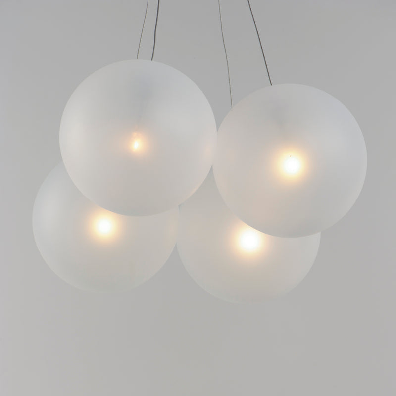 Clusters of glass globes in various sizes and color are suspended from a central point and burst outward. Configurations include a 4-Light, 9-Light, and 12-Light cluster and can be mounted close to the ceiling or included down rods to extend the height. Choose from options of Clear or Frosted glass globe clusters paired with Satin Nickel frames for an airy transitional design or be bold with Mirror Smoked glass or a varied combination of the glass including amber tinted suspended on a Matte Black frame with thin black cables. Small-scaled LED G4 lamps are included with the fixtures and centered in the glass accentuating the scale of the glass.