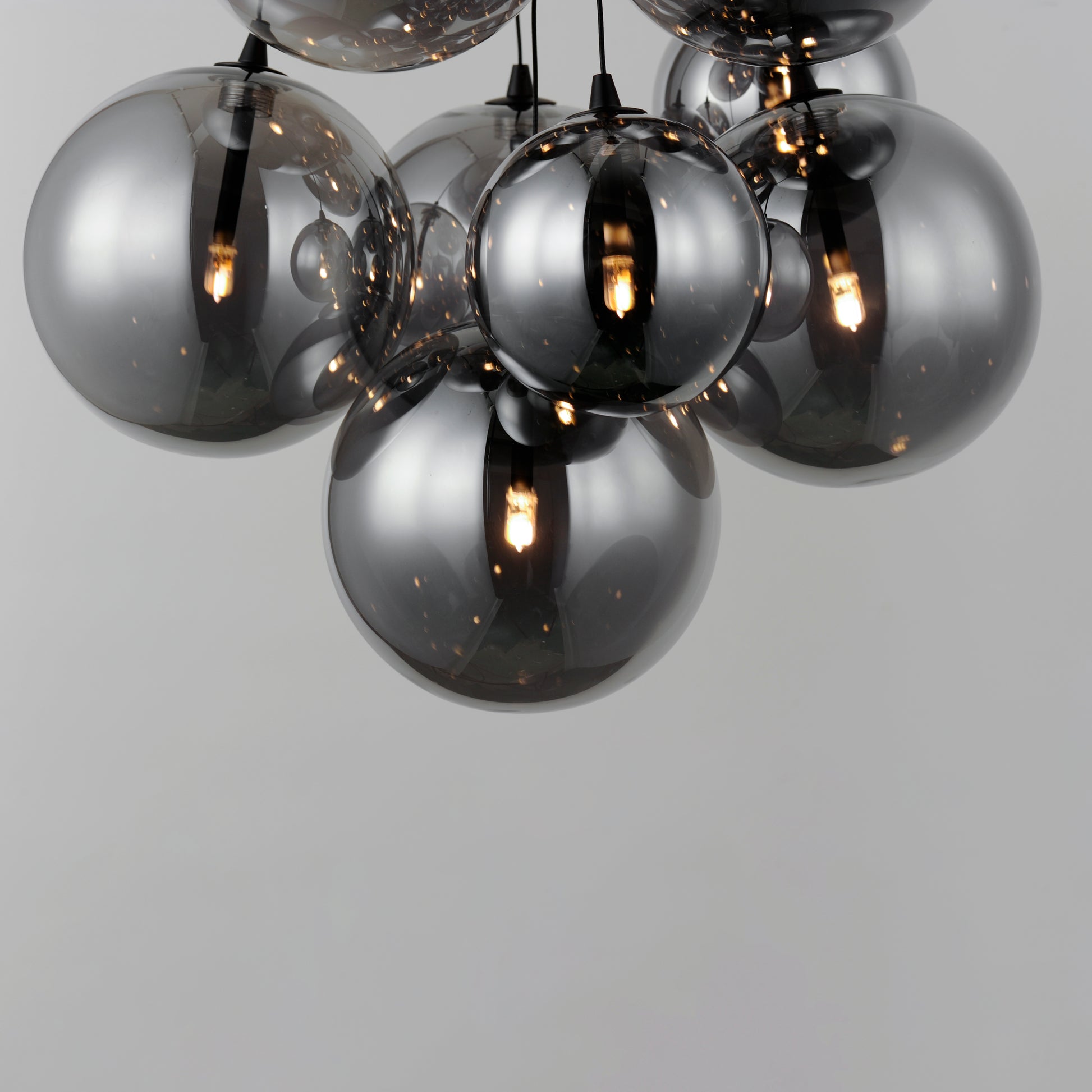 Clusters of glass globes in various sizes and color are suspended from a central point and burst outward. Configurations include a 4-Light, 9-Light, and 12-Light cluster and can be mounted close to the ceiling or included down rods to extend the height. Choose from options of Clear or Frosted glass globe clusters paired with Satin Nickel frames for an airy transitional design or be bold with Mirror Smoked glass or a varied combination of the glass including amber tinted suspended on a Matte Black frame with thin black cables. Small-scaled LED G4 lamps are included with the fixtures and centered in the glass accentuating the scale of the glass.