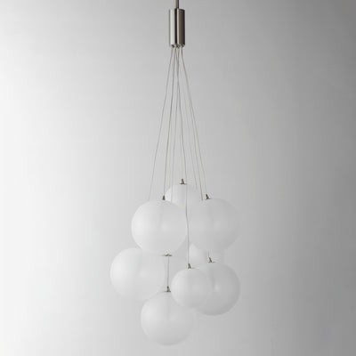 Clusters of glass globes in various sizes and color are suspended from a central point and burst outward. Configurations include a 4-Light, 9-Light, and 12-Light cluster and can be mounted close to the ceiling or included down rods to extend the height. Choose from options of Clear or Frosted glass globe clusters paired with Satin Nickel frames for an airy transitional design or be bold with Mirror Smoked glass or a varied combination of the glass including amber tinted suspended on a Matte Black frame with thin black cables. Small-scaled LED G4 lamps are included with the fixtures and centered in the glass accentuating the scale of the glass.