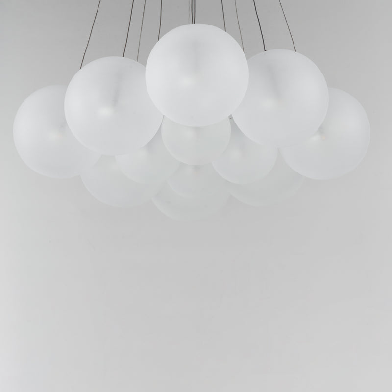 Clusters of glass globes in various sizes and color are suspended from a central point and burst outward. Configurations include a 4-Light, 9-Light, and 12-Light cluster and can be mounted close to the ceiling or included down rods to extend the height. Choose from options of Clear or Frosted glass globe clusters paired with Satin Nickel frames for an airy transitional design or be bold with Mirror Smoked glass or a varied combination of the glass including amber tinted suspended on a Matte Black frame with thin black cables. Small-scaled LED G4 lamps are included with the fixtures and centered in the glass accentuating the scale of the glass.