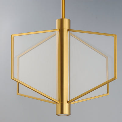 Translucent acrylic panels dotted to guide indirect LED strips integrated into the body of the fixture. The angular forms of the pendants create a strikingly modern display of light that is both airy and voluminous. An additional LED GU10 bulb is recessed at the bottom of the fixture for additional functional light. Available in Satin Brass or Matte Black finishes.