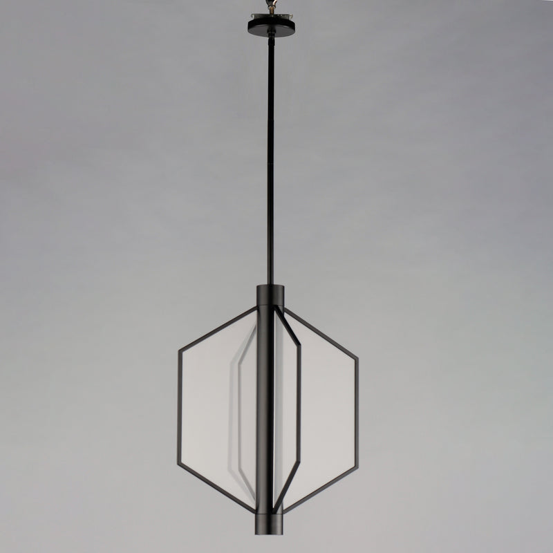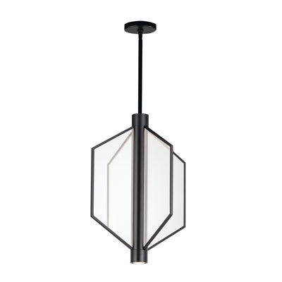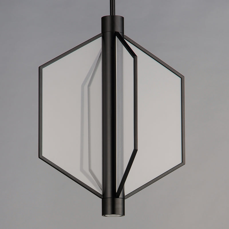 Translucent acrylic panels dotted to guide indirect LED strips integrated into the body of the fixture. The angular forms of the pendants create a strikingly modern display of light that is both airy and voluminous. An additional LED GU10 bulb is recessed at the bottom of the fixture for additional functional light. Available in Satin Brass or Matte Black finishes.