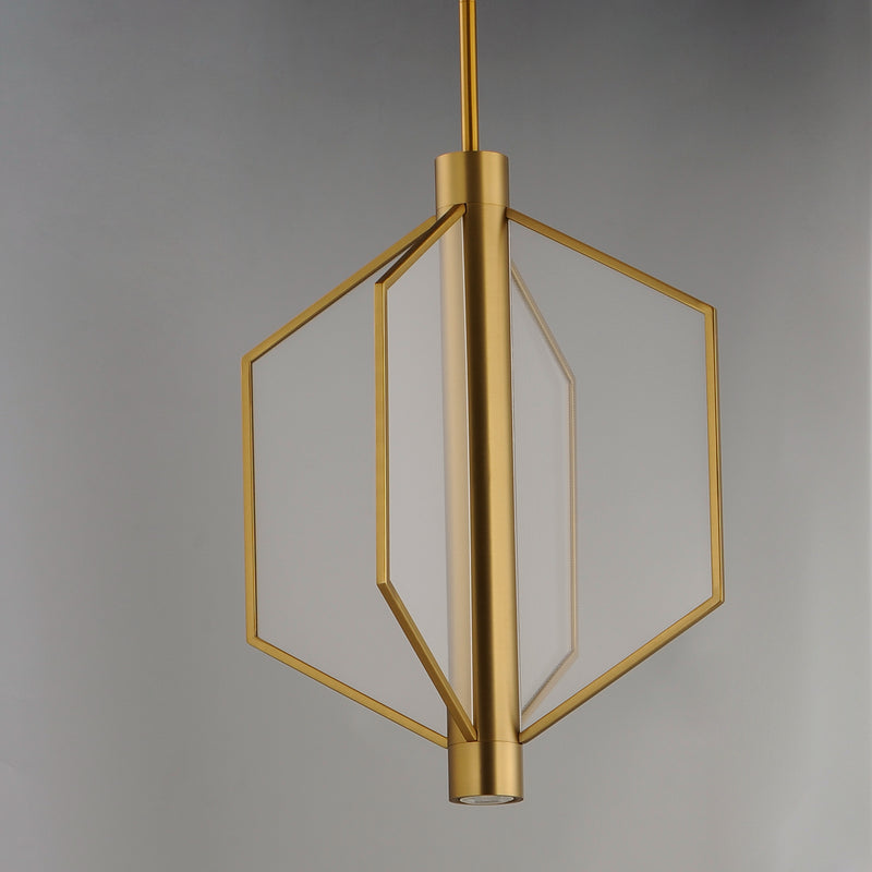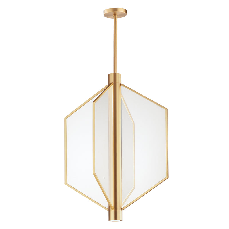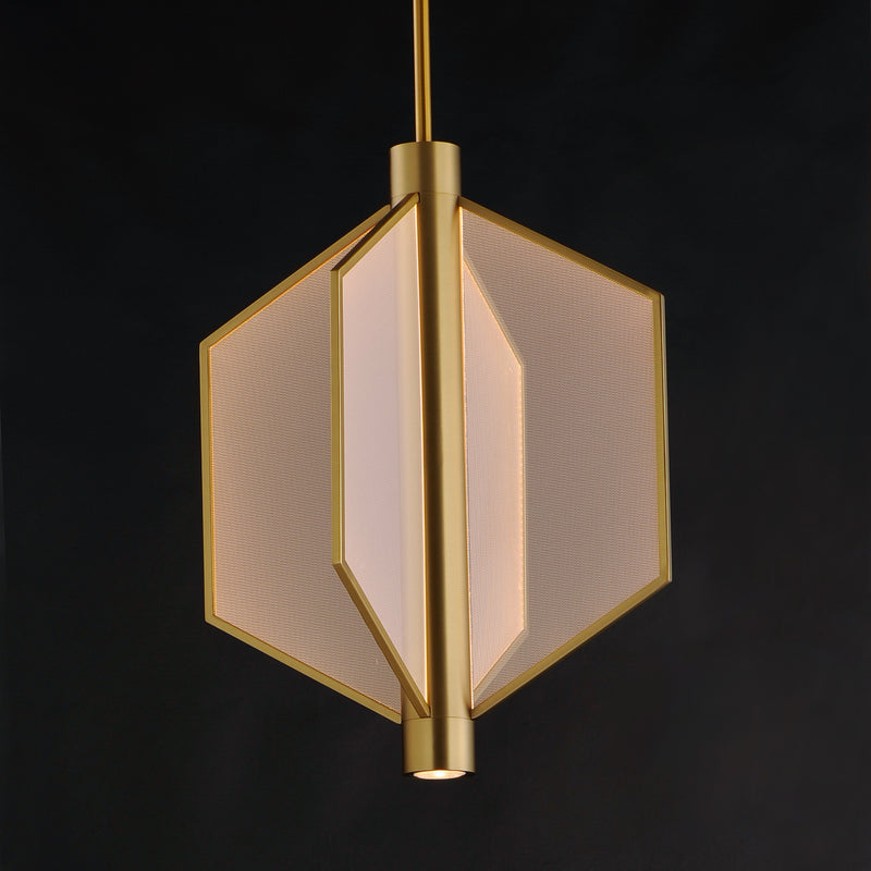 Translucent acrylic panels dotted to guide indirect LED strips integrated into the body of the fixture. The angular forms of the pendants create a strikingly modern display of light that is both airy and voluminous. An additional LED GU10 bulb is recessed at the bottom of the fixture for additional functional light. Available in Satin Brass or Matte Black finishes.