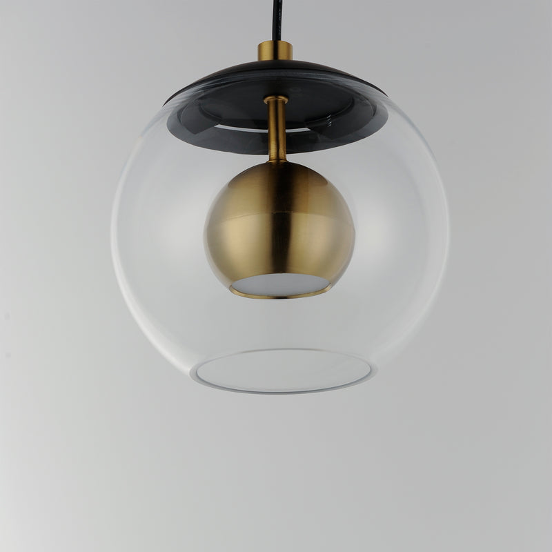 Three sizes of thick Clear glass orbs are suspended displaying a small aluminum sphere encompassed within. Discretely recessed dedicated LED provides ample lighting without glare. Branching out from a central structural column, the striking Black and Satin Brass combination an additional LED light source directs light downward. These atomically inspired fixtures are sure to make a statement.