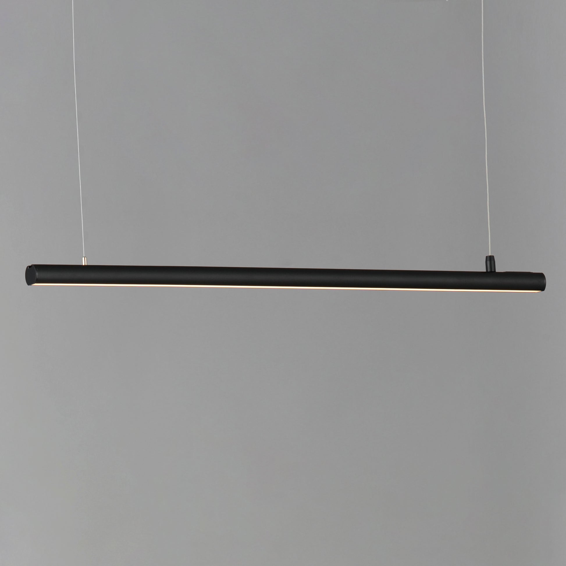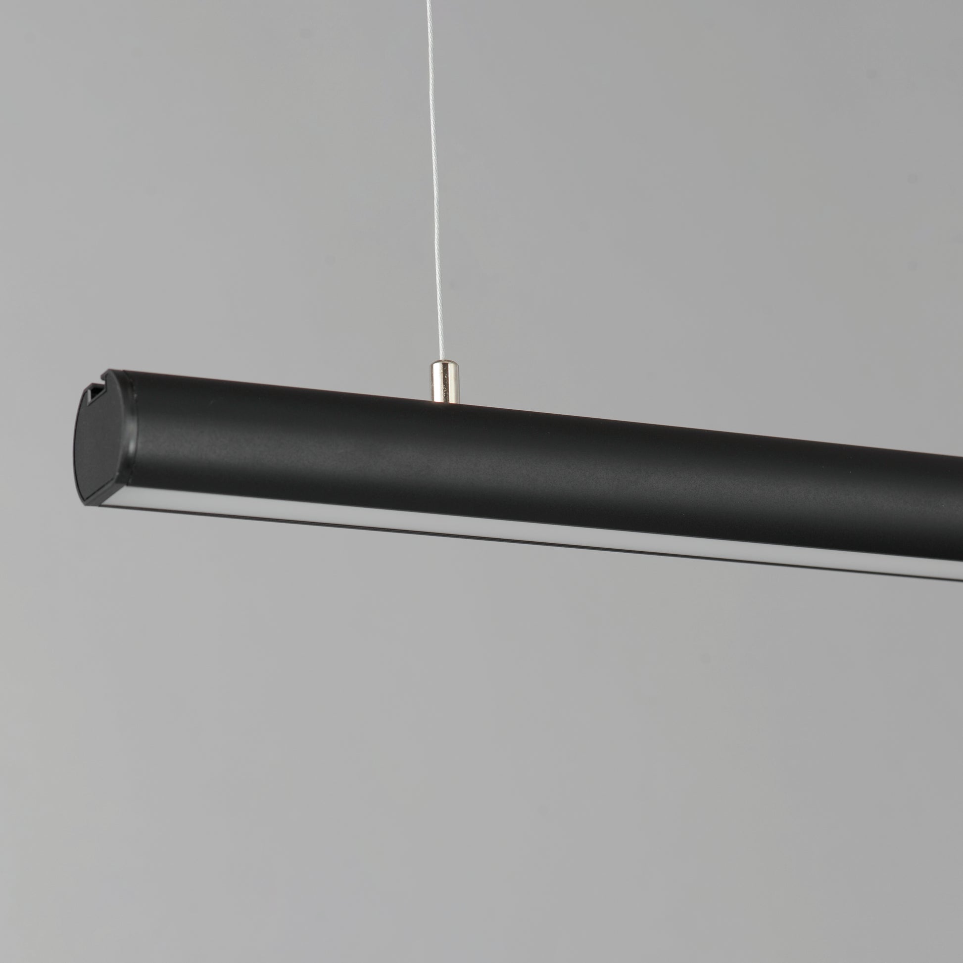 Elongated tubes of LED light are housed in incredibly small 1" diameter aluminum and suspended by nearly invisible support cables. Engineered to connect the various lengths end-to-end or with use of the rigid, angled adapters, adds endless applications for creativity and function. Each length includes a power feed within a surface mounted canopy and non-electrical support cables that standoff using ceiling anchors. With no additional power source components required, the continuous run pendants in this series are a welcome convenience for commercial applications. Lengths range from 36" to impressive 96" long. Individually, the fixtures provide ample lighting downward with minimal disruption to the architectural sight lines of a space. Available in Black, White, and brushed Aluminum finishes these are exemplary streamlined forms with functional purpose.