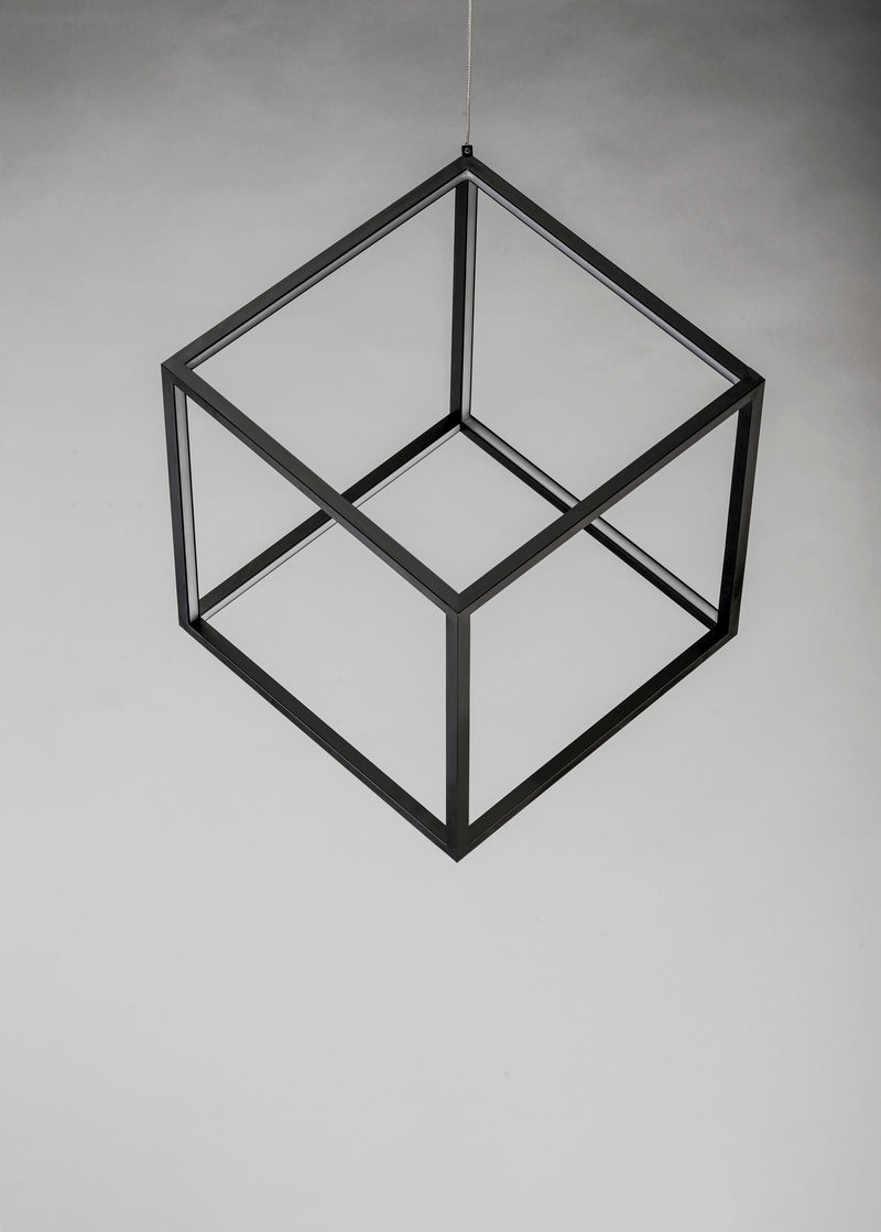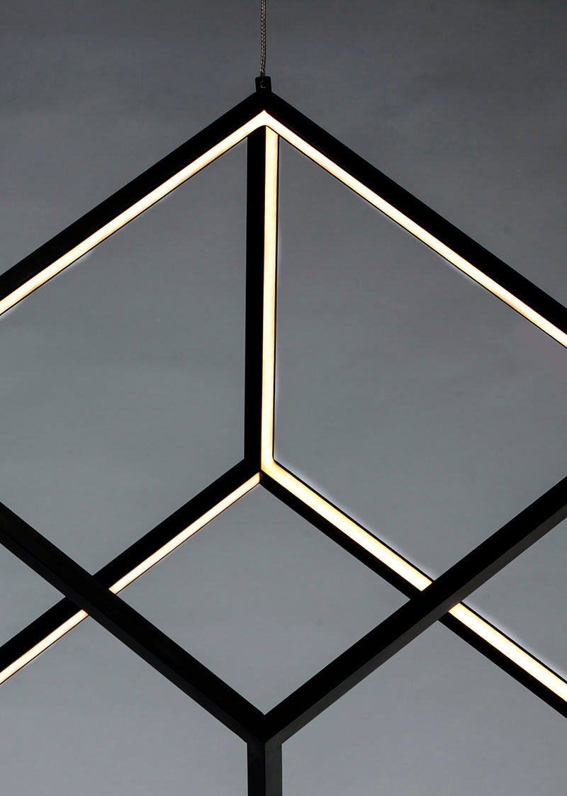 Cubes of Black and Polished Chrome are lit from the inside by LED strips concealed in a channel. The silhouette created by this inward design creates a dramatic light effect.