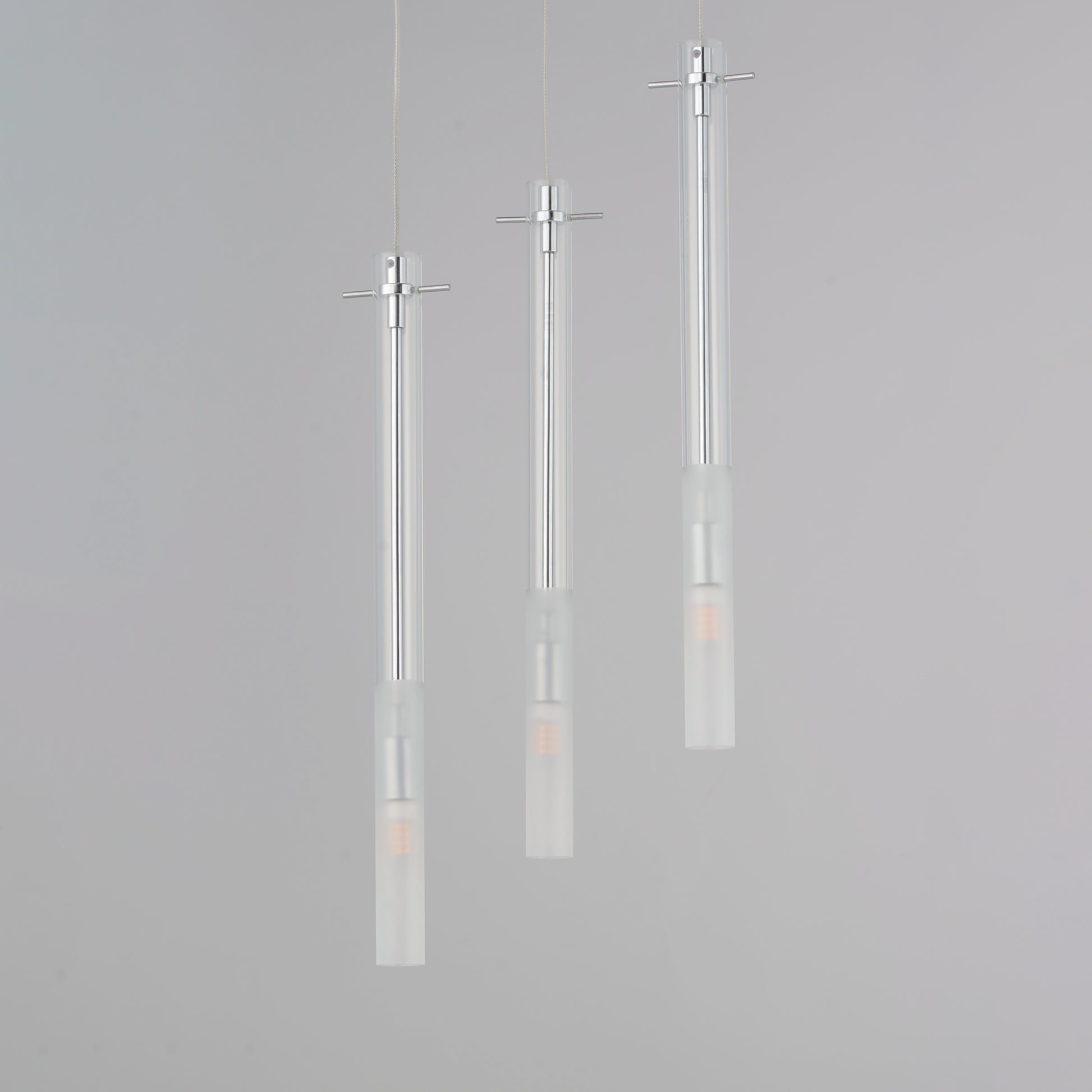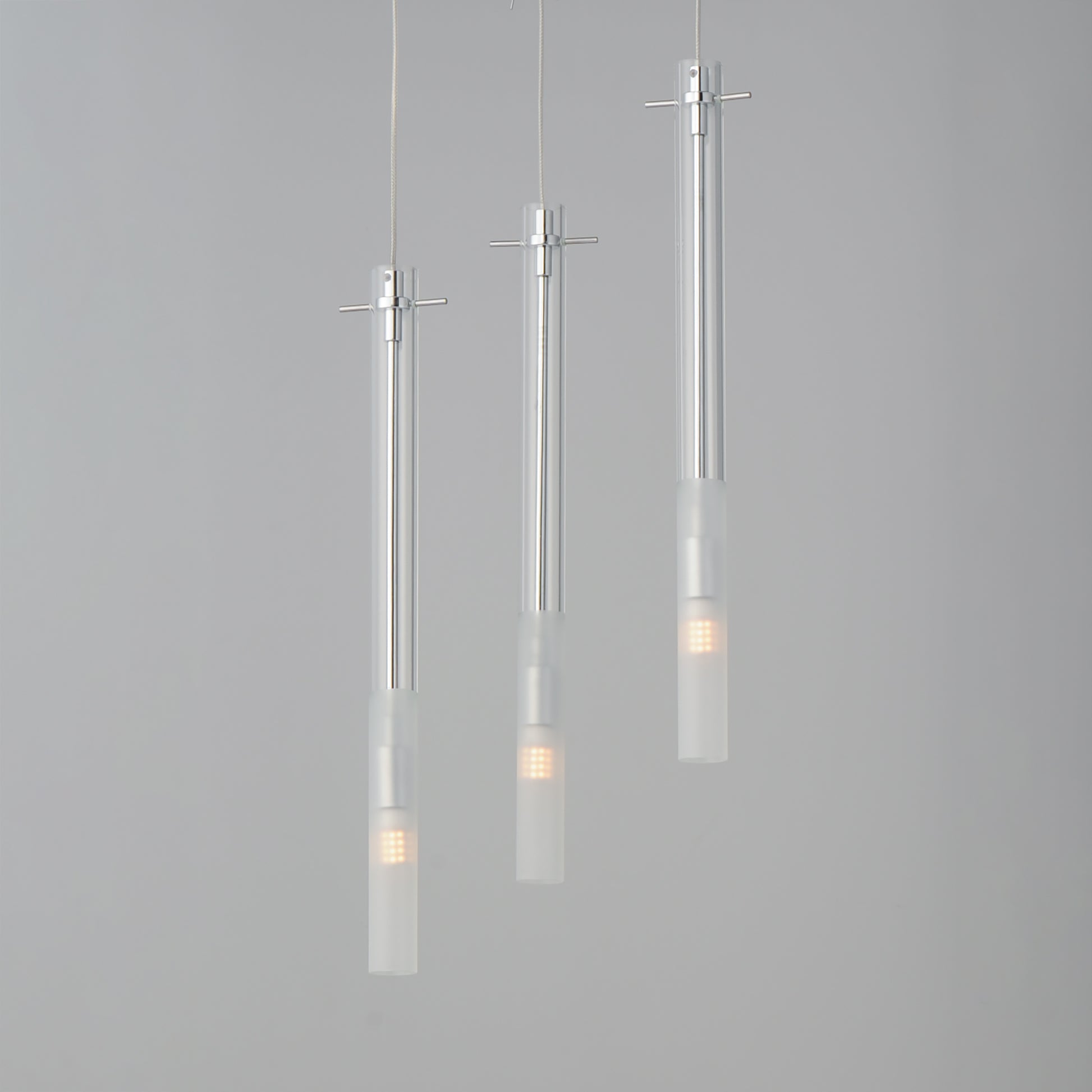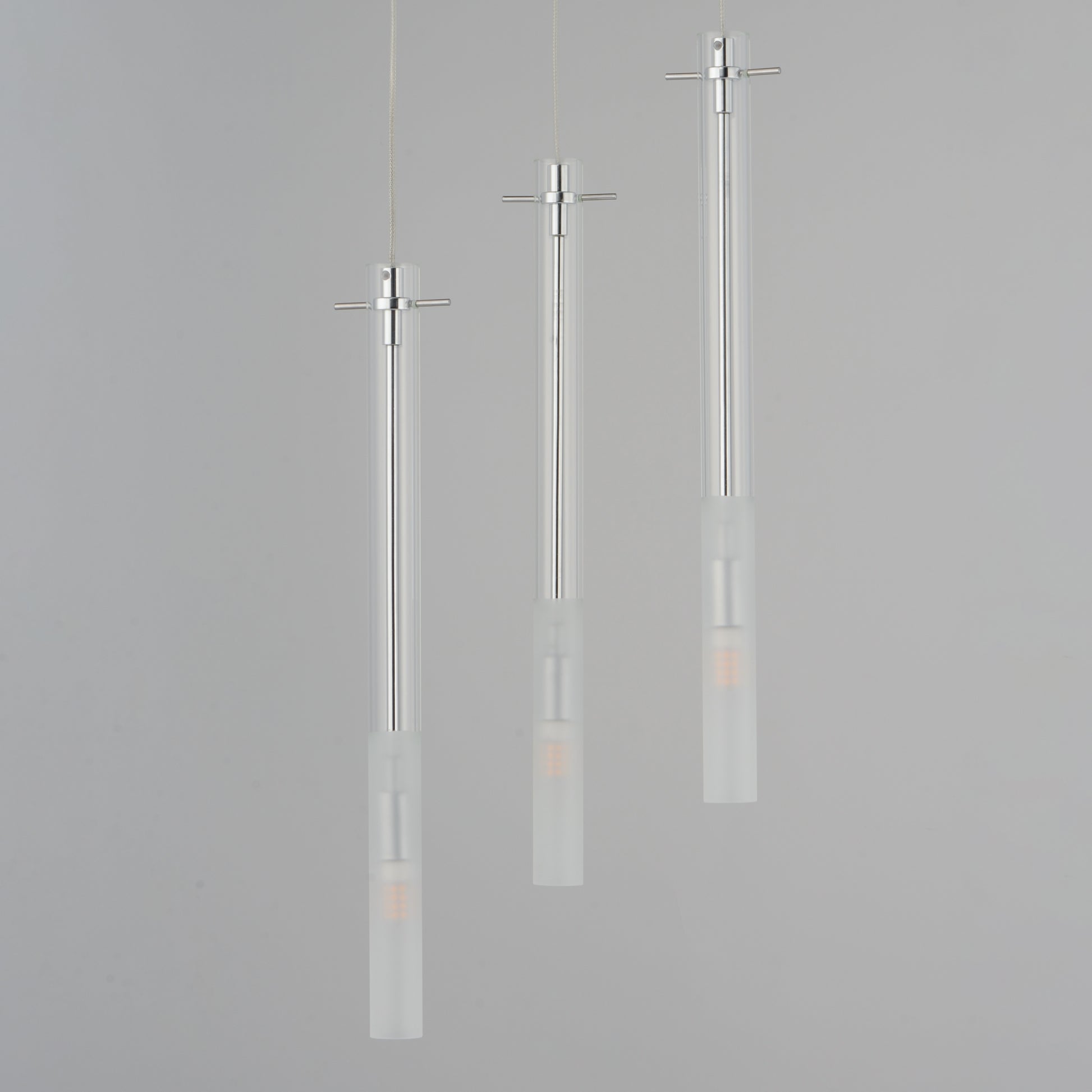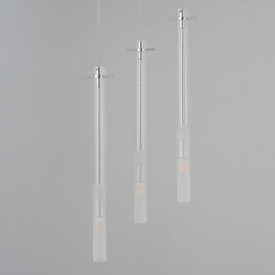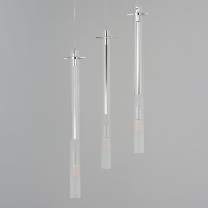 Slender Clear glass tubes sheath a Polished Chrome rod that supports small LED lamps. The glass is etched at a dividing line in the glass to softly diffuse the light. Available in two lengths of glass tube, the pendants are also available in multiple configurations that create a modern candle-like cluster. The surface mounted option supports the glass on a structure that allows it to hang freely for dual purpose as a ceiling flush mount or a hanging glass shade when mounted to a wall. JA8 Listed LED G9 lamps are provided for efficient lighting and reduced energy consumption.