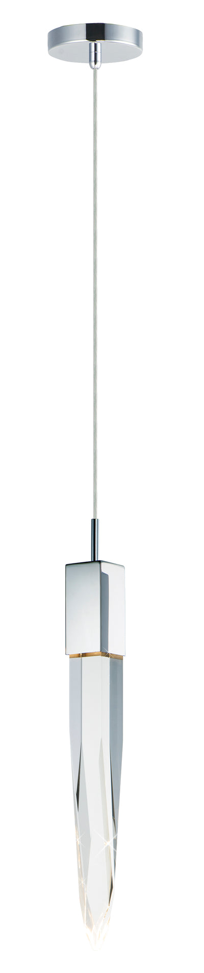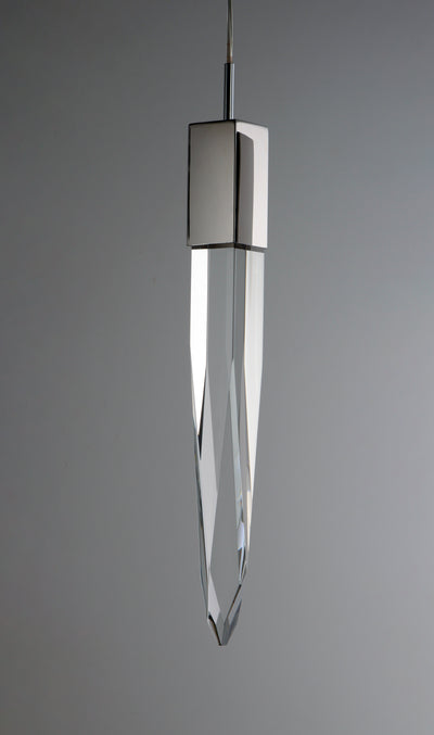 Stalactites of Clear Beveled crystal suspend from your choice of Polished Chrome or Black supports, can be hung at various heights to create a spectacular array. The crystal shimmers as light diffuses through the facets powered by 90 CRI LED dimmable modules.