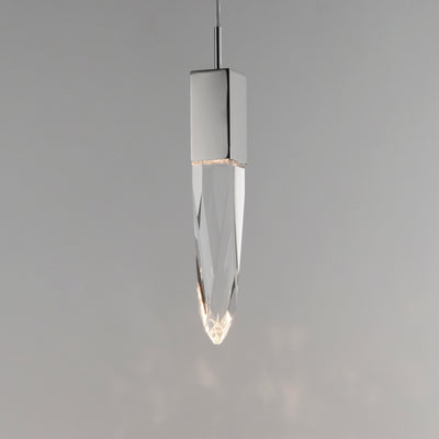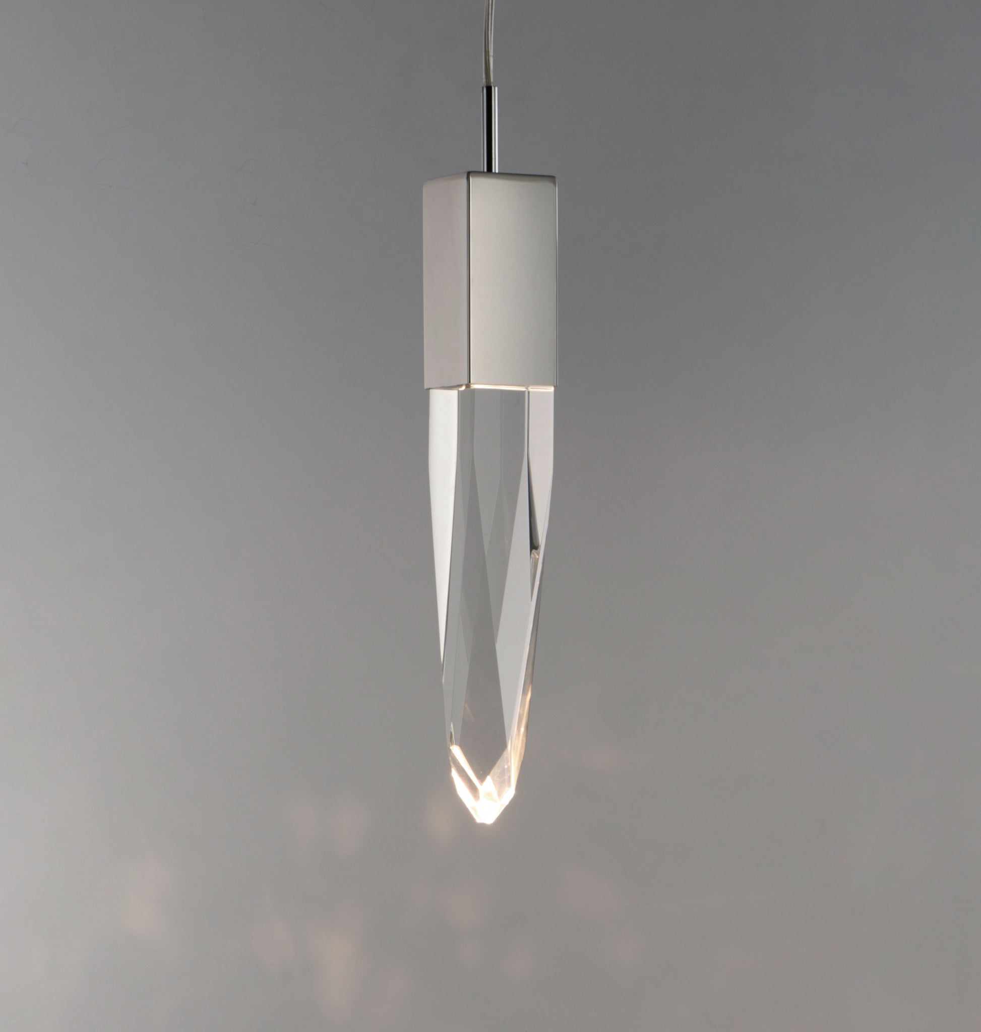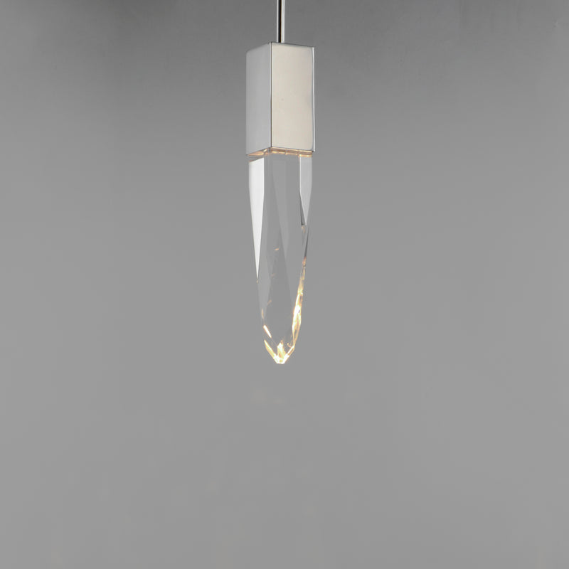 Stalactites of Clear Beveled crystal suspend from your choice of Polished Chrome or Black supports, can be hung at various heights to create a spectacular array. The crystal shimmers as light diffuses through the facets powered by 90 CRI LED dimmable modules.