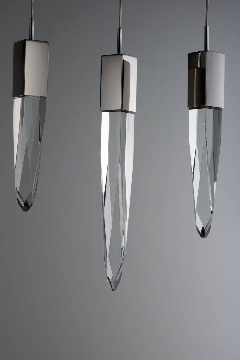 Stalactites of Clear Beveled crystal suspend from your choice of Polished Chrome or Black supports, can be hung at various heights to create a spectacular array. The crystal shimmers as light diffuses through the facets powered by 90 CRI LED dimmable modules.