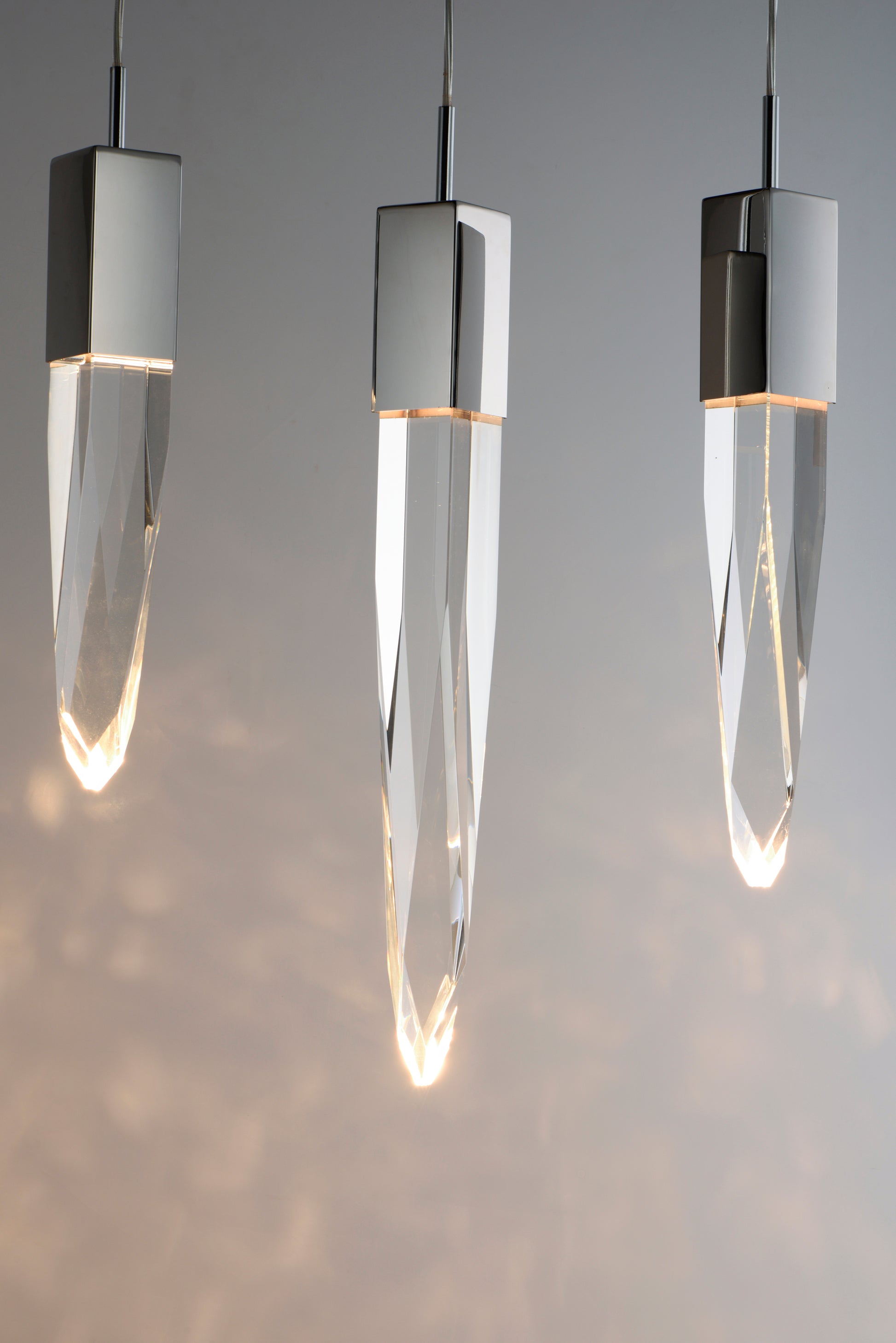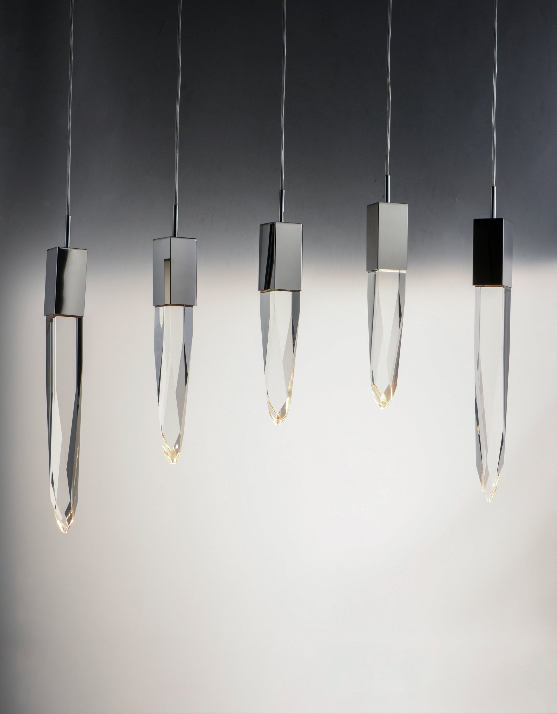Stalactites of Clear Beveled crystal suspend from your choice of Polished Chrome or Black supports, can be hung at various heights to create a spectacular array. The crystal shimmers as light diffuses through the facets powered by 90 CRI LED dimmable modules.