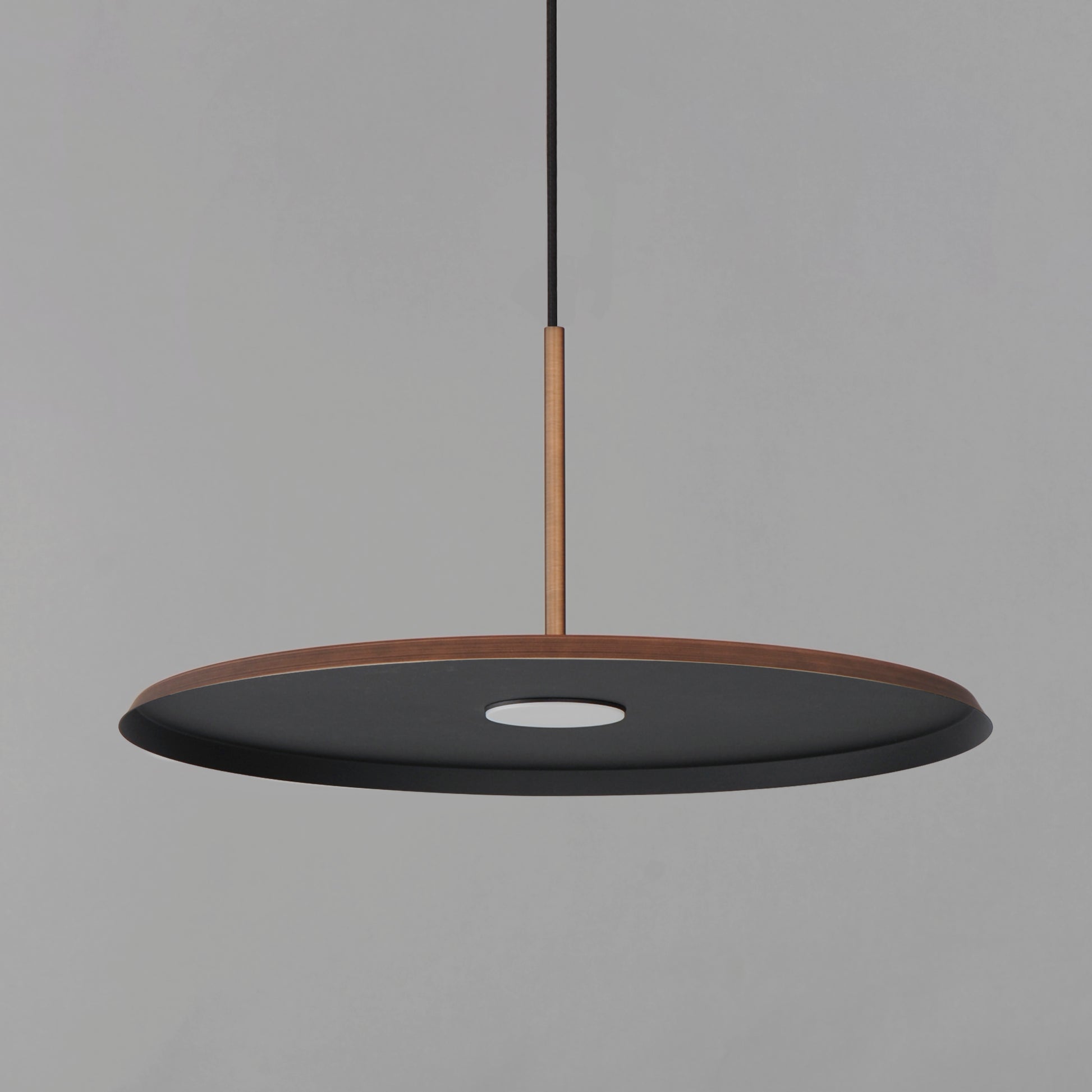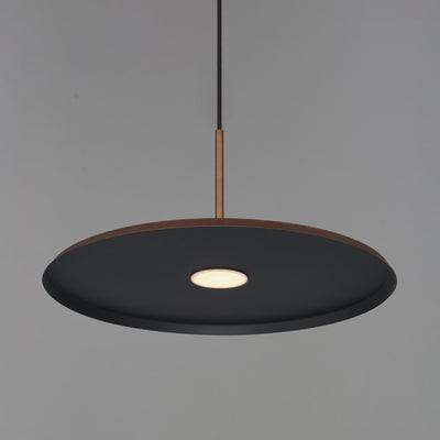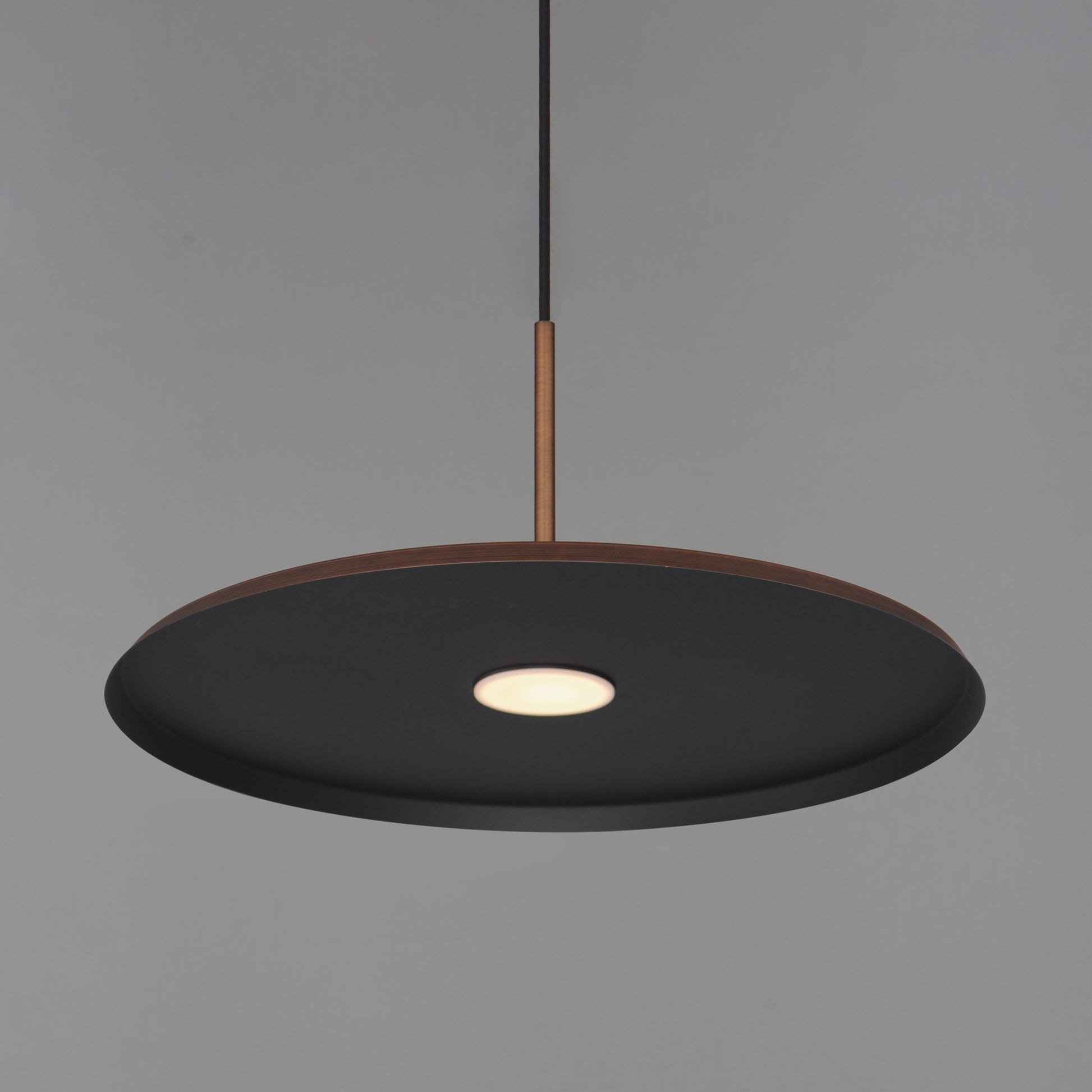 Wide flat discs house LED engines that disappear when viewed at the pendants edge. Supported at their center by thin tubes and black cable, machined aluminum housings feature laterally cut concentric circles drawing inspiration from the grooves in a vinyl record. Finished in your choice of Matte Black, Antique Brass, or Antique Copper, the modern design feels vintage and retro widening the range of compatibility within architectural aesthetics.