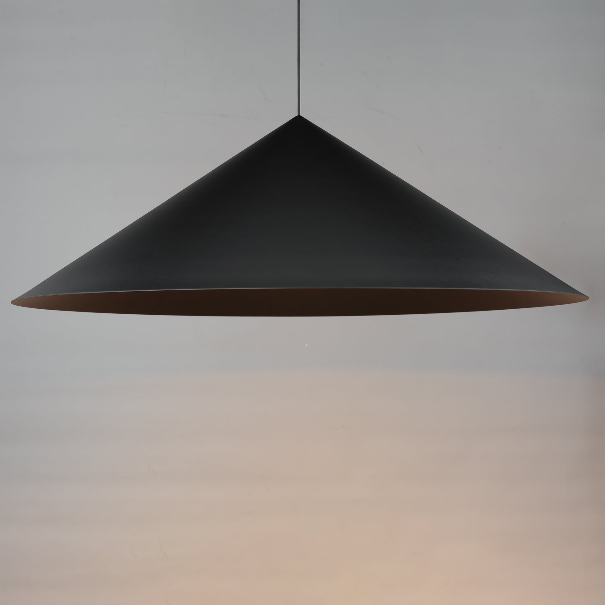 Sleek and simply, the effortlessly chic oversized cone pendants add a modern touch to elevate your space. A surprisingly bright single light source is recessed within a secondary smaller aperture cone shade painted white on its interior to reflect more and beam additional lighting downward without glare. This distinctive cut off accentuates the black finish on the surfaces between two cones. Available in Black and Antique Brass, this pendant series exemplifies the enduring elegance of the cone form in design.