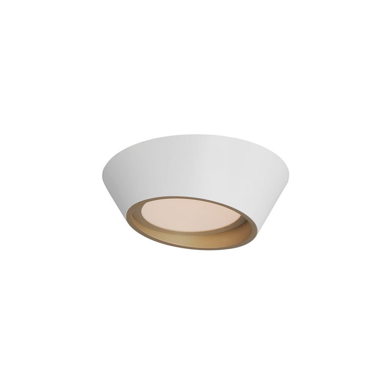 A distinctive slant defines this series of flush mounts. Finished in an exterior sandy Matte White finish with an interior in Gold, the flush mounts add unique flair to your ceiling. The smallest model is wet location rated and can be used on wall as well.