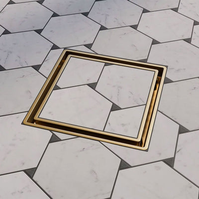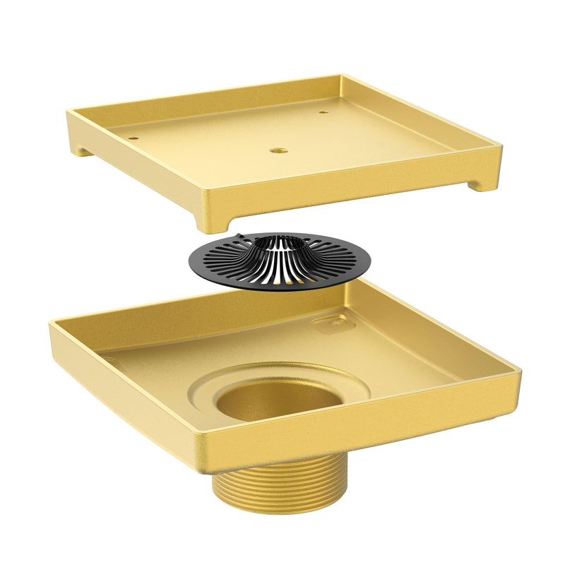 The Ebbe ETID-6-CG 6" Legacy Solid Forged Brass Tile-In Drain in Champagne Gold offers a larger format for enhanced visual impact and functionality in high-end tiled showers. Constructed from solid forged brass and finished in a warm, elegant champagne gold, this 6" tile-in drain is designed for seamless integration with surrounding floor tile. It features a 4.6" textured tray and multiple weep holes for strong thin-set bonding, along with a 2" threaded riser for easy height adjustment and leveling. With a removable hair trap for convenient maintenance, this premium drain is ideal for luxury showers seeking a bold, sophisticated finish with superior performance.