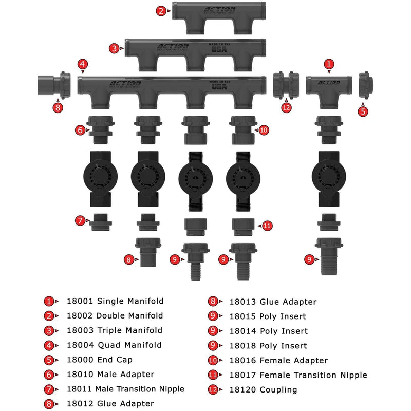 Our 3/4" PVC Spigot or Slip adapters connect the Action Manifold System to you PVC pipe. You can glue 3/4" pipe to the inside or 1" pipe with a coupling.