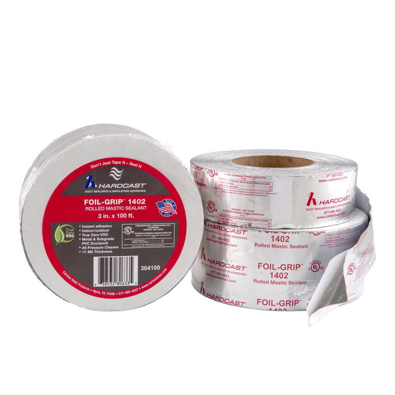 Foil-Grip 1402 is a pressure-sensitive, 40-year cycle, duct joint and general purpose rolled mastic sealant. It provides an instant water-resistant air-tight grip to most surfaces including sheet metal, flex duct, and PVC-coated duct. Foil-Grip 1402 is suitable for subgrade application on PVC-coated duct and is ideal for replacement applications.