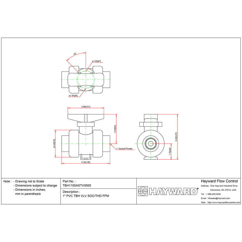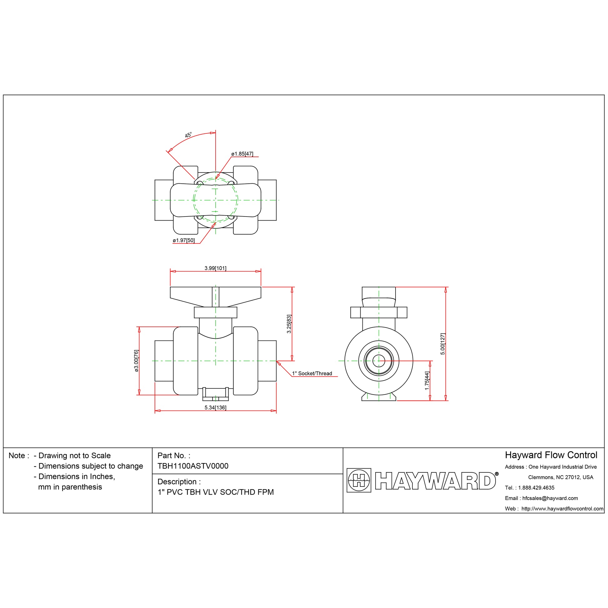 Hayward TBH1100ASTV0000 - 1" PVC TBH Series Ball Valve Socket or Threaded Ends - FPM Seals