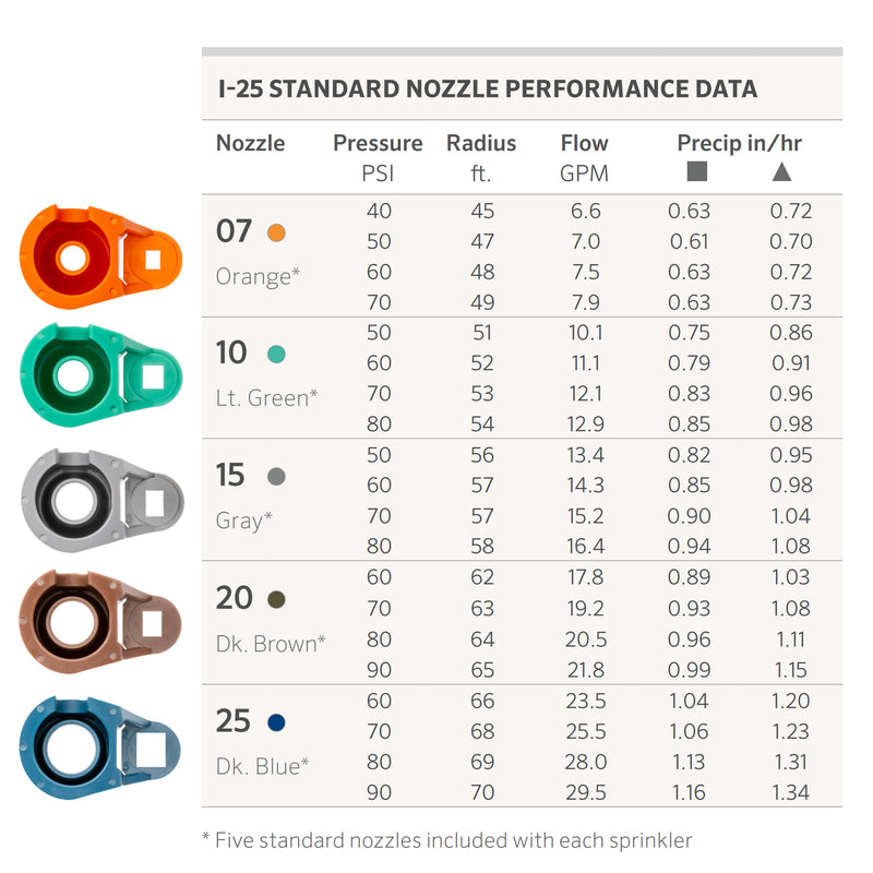 The I-25 gets the job done with power, efficiency, and commercial-grade reliability. With a robust watering radius of 40’ to 71’, this rotor can be used in a variety of applications and environments. Its compact, highly durable design comes with an optional stainless steel riser for tough-as-nails strength. With a 5-year warranty, the I-25 also has options for reclaimed water ID and high-speed. A standard check valve is built in, and a wide selection of high performance nozzles are available. Efficient, tough, and built-to-last, Hunter’s I-25 rotors work hard day in and day out so you don't have to.