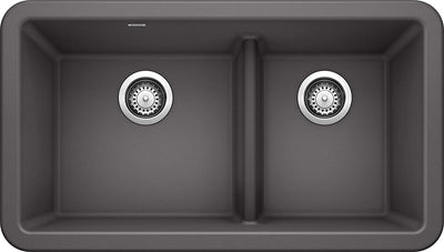 The BLANCO IKON collection provides farmhouse inspiration with designer flexibility built right in. The IKON is the first apron front sink made of natural granite composite, SILGRANIT. With its slightly angled apron design, the IKON 33" will add an architectural element to your kitchen. With Germany engineering at its core, the IKON SILGRANIT Farmhouse Sink is exceptionally resistant to heat, scratches and impact, while also being highly resistant to acids and stains. The IKON 33" 60/40 Double Bowl Farmhouse Sink with Low Divide provides the functionality of a double bowl, but with a lower sink partition for optimal use of its 33” width. With the BLANCO IKON you can maneuver large pots, long-handled pans or baking sheets with ease.