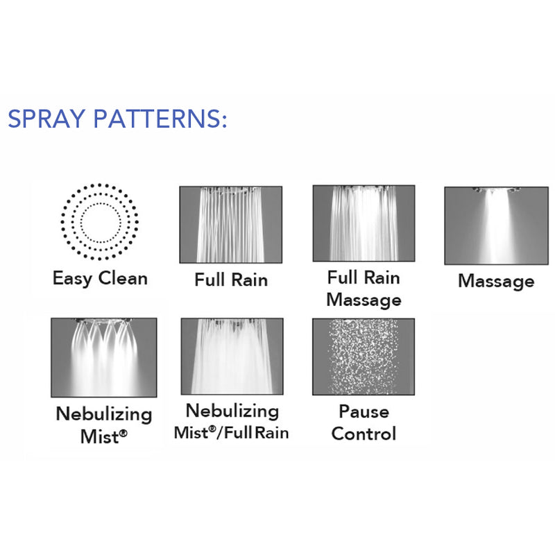 - Spray Patterns: Easy Clean, Full Rain, Full Rain Massage, Massage, Nebulizing Mist, Nebulizing Mist / Full Rain, Pause Control