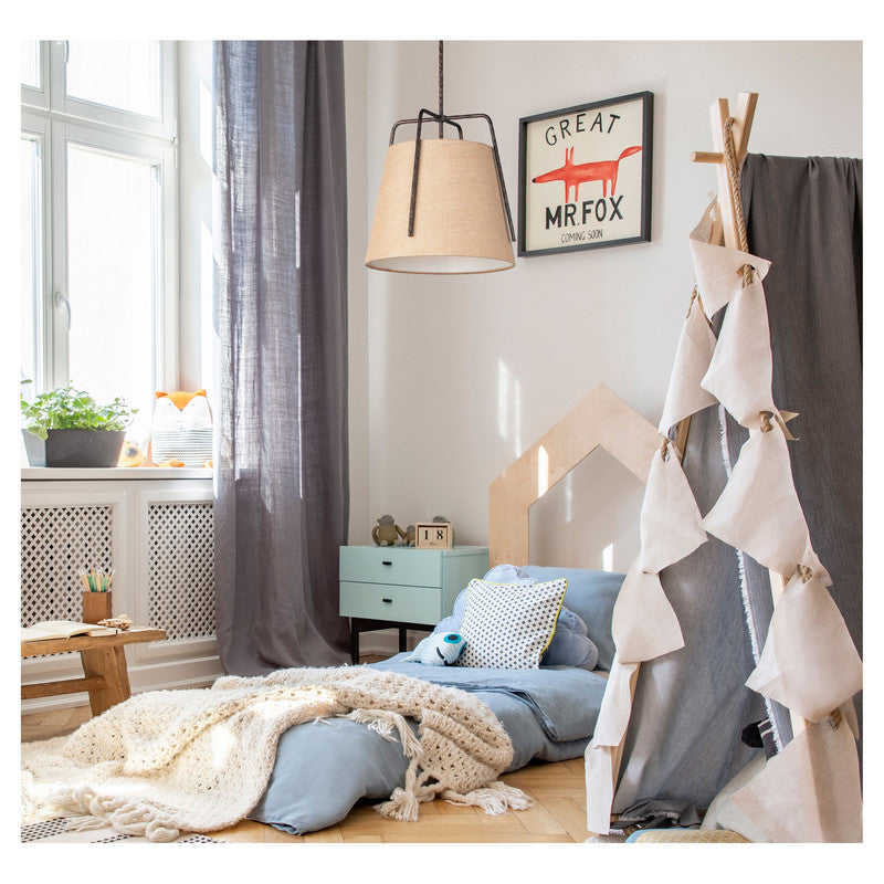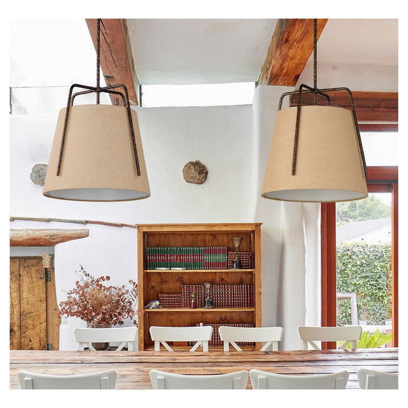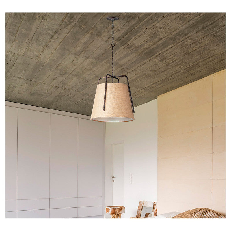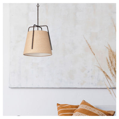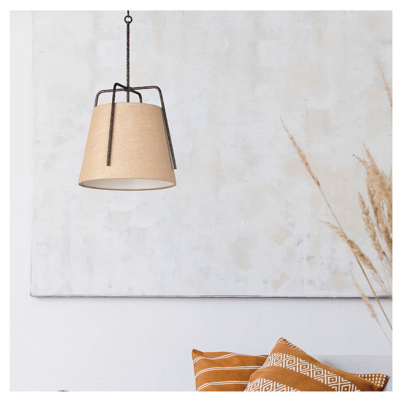Rustic pendants of hammered iron finished in Oil Rubbed Bronze embraces a shade of Burlap fabric to create a casually comfortable appeal. Available in 2 sizes which allows for multiple pendants over a bar or a single pendant over a table.