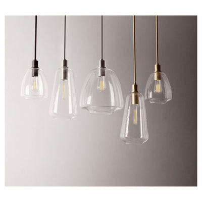 Pendants of Clear glass in unique elongated and undulating shapes with various sizes. This series pairs well with popular finishes in hardware and plumbing, giving you the flexibility to take chances with designer statement pieces. The metalwork is available in your choice of Matte Black, Satin Brass, or Satin Nickel. A coordinating wall sconce pairs well with the collection. Use filament bulbs to complete the look.