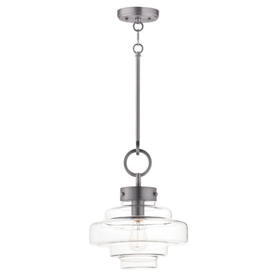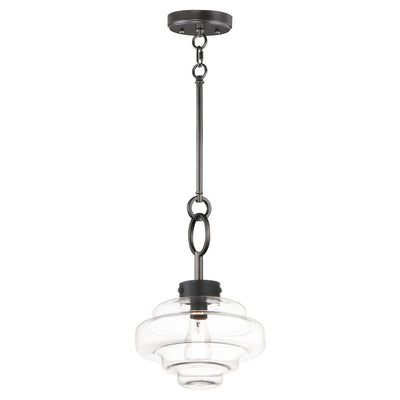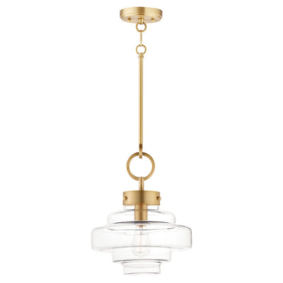 A sizable layered glass oscillates depth and is supported by three industrial set screws for support. Available as a pendant or flush mount, the pendant also features an oversized ring to evoking nautical vibes while remaining minimalist in its design. Available in Satin Brass, Satin Nickel, or Matte Black, pair the clear glass shades with a vintage filament lamps to complete the look.