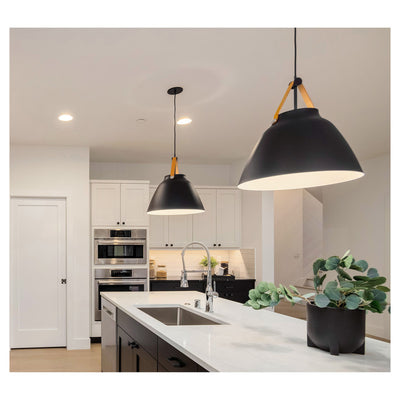 Inspired by classic Scandinavian design, these metal spun pendants of Black, White and Brushed Platinum feature mixed materials such as opal white glass or natural elements like Walnut finished wood and leather straps.