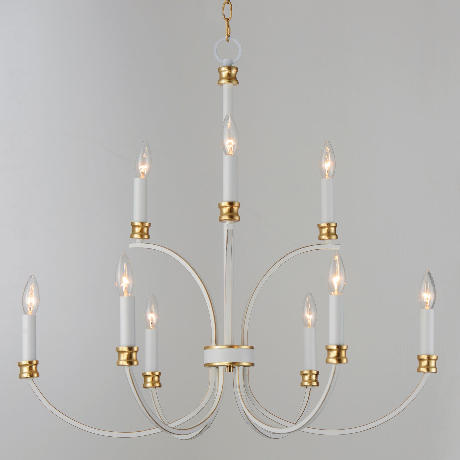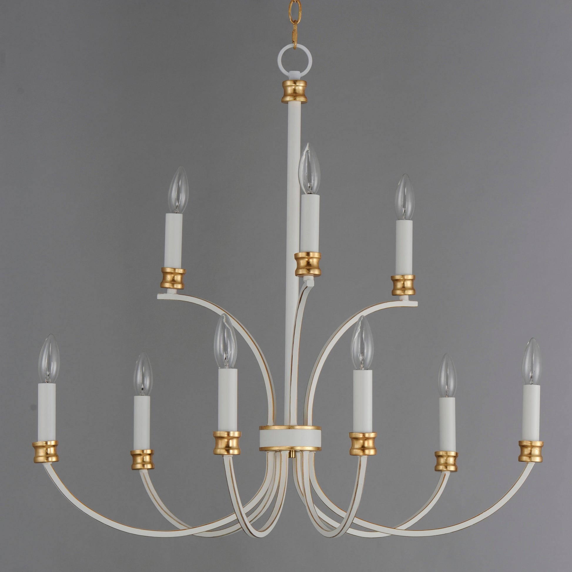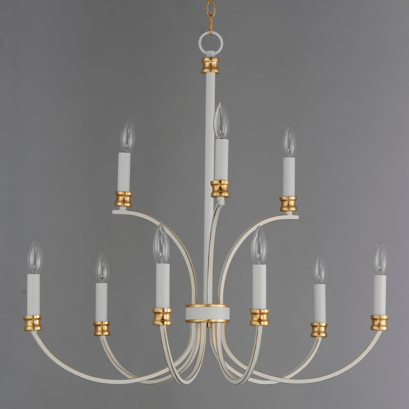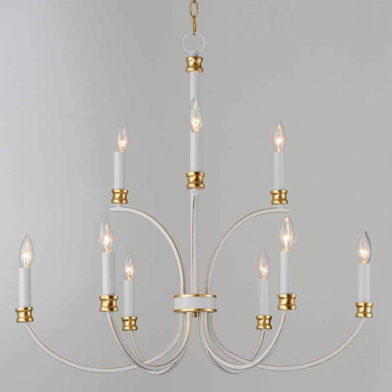 A lovely candelabra style collection with rich accents. This seemingly simple chandelier highlights classically curving accents in a stately combination of Black with Antique Brass accents or chic Weathered White with Gold Leaf accents. Taking a streamlined approach to the archetypal chandelier form, this series updates uses squared tubing to subtly modernize an approachable design with exposed candelabra lighting.