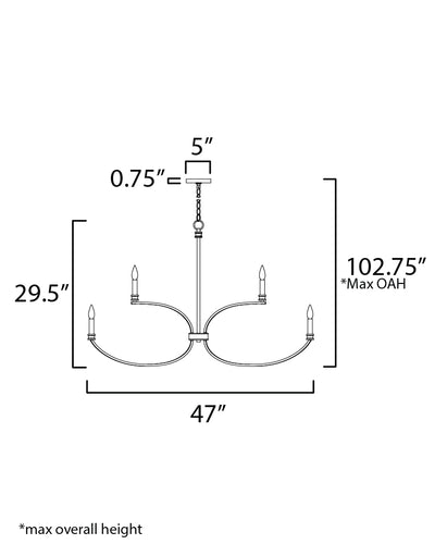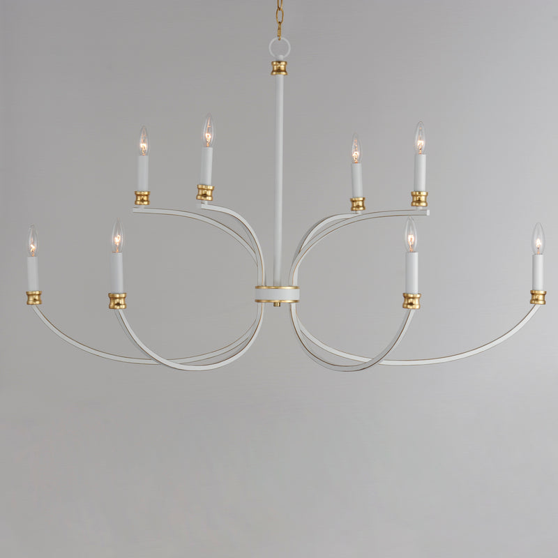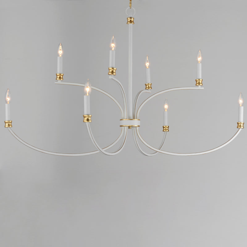 A lovely candelabra style collection with rich accents. This seemingly simple chandelier highlights classically curving accents in a stately combination of Black with Antique Brass accents or chic Weathered White with Gold Leaf accents. Taking a streamlined approach to the archetypal chandelier form, this series updates uses squared tubing to subtly modernize an approachable design with exposed candelabra lighting.