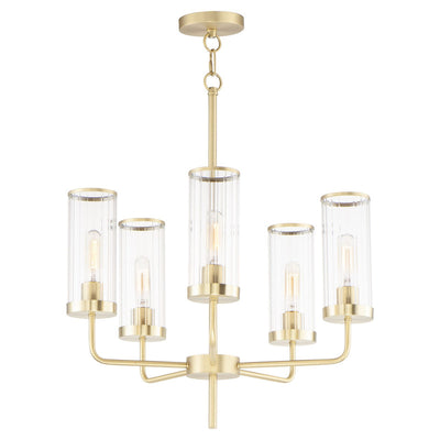 Simple, yet stylish, this minimal chandelier comes in your choice of Satin Brass or Matte Black bringing contemporary appeal. Clear Ribbed glass shades are fitted with rings in a coordinating color to complete the look.