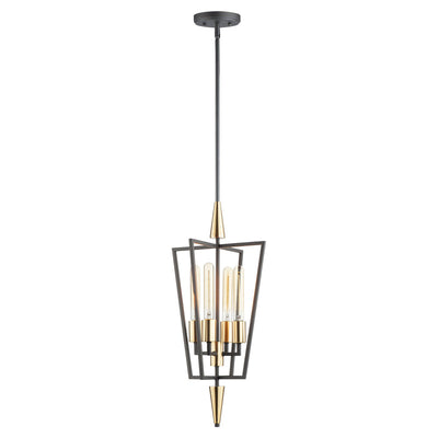 Sharp lines radiate from a pointed pin central body creating geometric angled wings that are sandwiched between matching conical fonts. Finished in a combination Antique Brass and Black, this collection is both contemporary and warm. Complete this look with vintage T10 light bulbs to for the full effect.