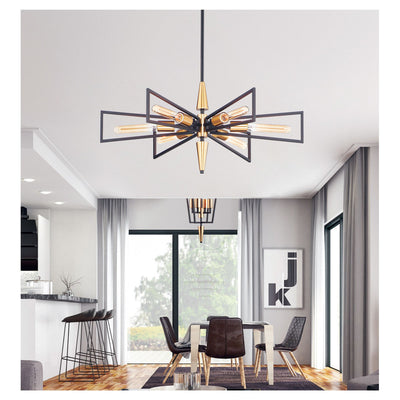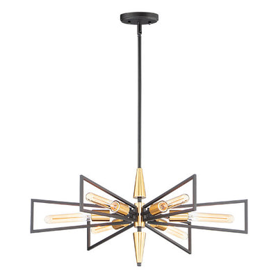 Sharp lines radiate from a pointed pin central body creating geometric angled wings that are sandwiched between matching conical fonts. Finished in a combination Antique Brass and Black, this collection is both contemporary and warm. Complete this look with vintage T10 light bulbs to for the full effect.