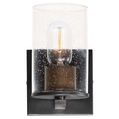 Cylinders in Clear Seedy glass on simple matte Black frames with Antique Brass socket covers. A clean and easily maintained fixture that easily coordinates with your stylish bathroom space.