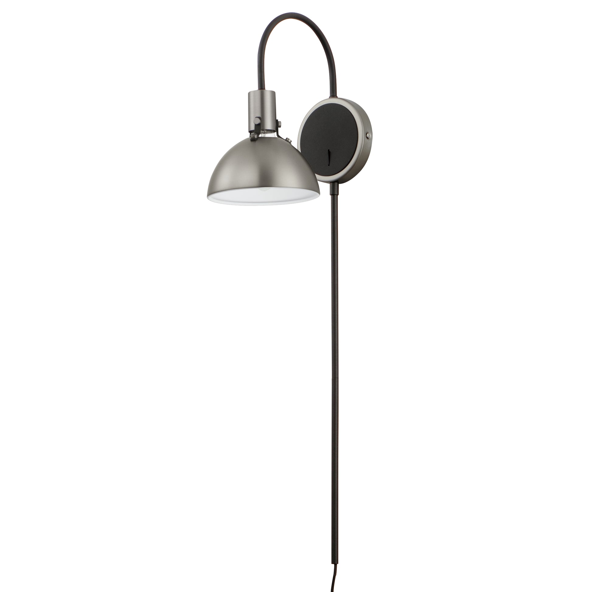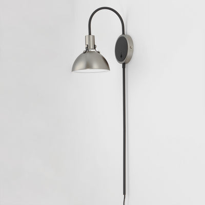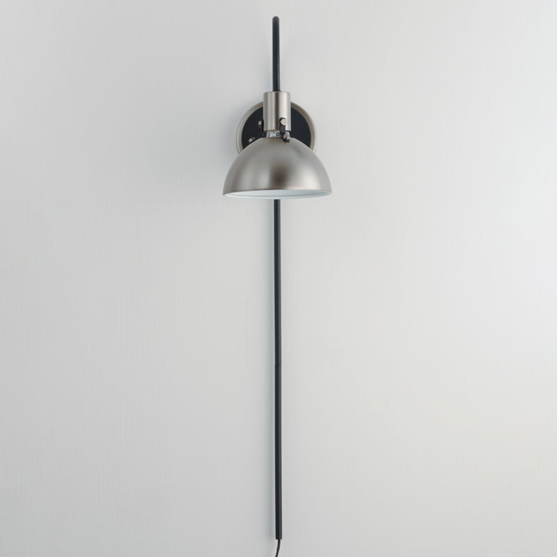 Sockets are suspended above a metal spun dome in your choice of Black or White with Gold accents or Satin Nickel with Black accents. A clean and simple approach to modern or transitional lighting, the opening allows light to shine through the opening atop while providing functional light below. This break in the two parts is supported with straps and decorative rivets in complimentary finishes for a subtlety tasteful two-tone finish. A coordinating pin-up wall sconce offers a bedside application to this design with integrated switch on its back plate and two feet of cord cover that can be removed and hardwired per your preference.