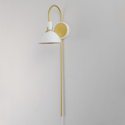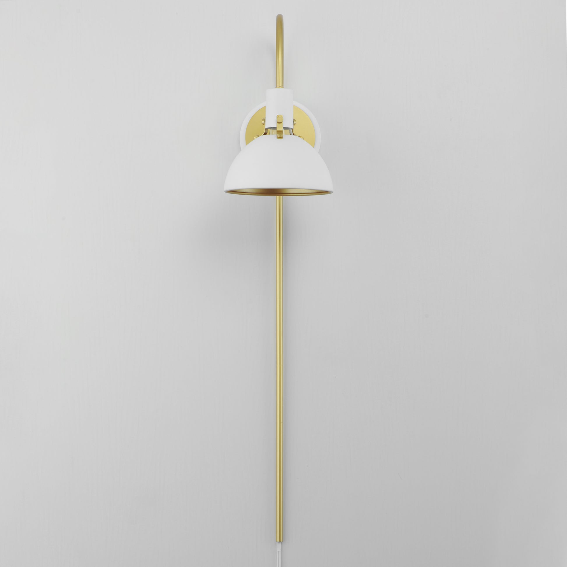 Sockets are suspended above a metal spun dome in your choice of Black or White with Gold accents or Satin Nickel with Black accents. A clean and simple approach to modern or transitional lighting, the opening allows light to shine through the opening atop while providing functional light below. This break in the two parts is supported with straps and decorative rivets in complimentary finishes for a subtlety tasteful two-tone finish. A coordinating pin-up wall sconce offers a bedside application to this design with integrated switch on its back plate and two feet of cord cover that can be removed and hardwired per your preference.