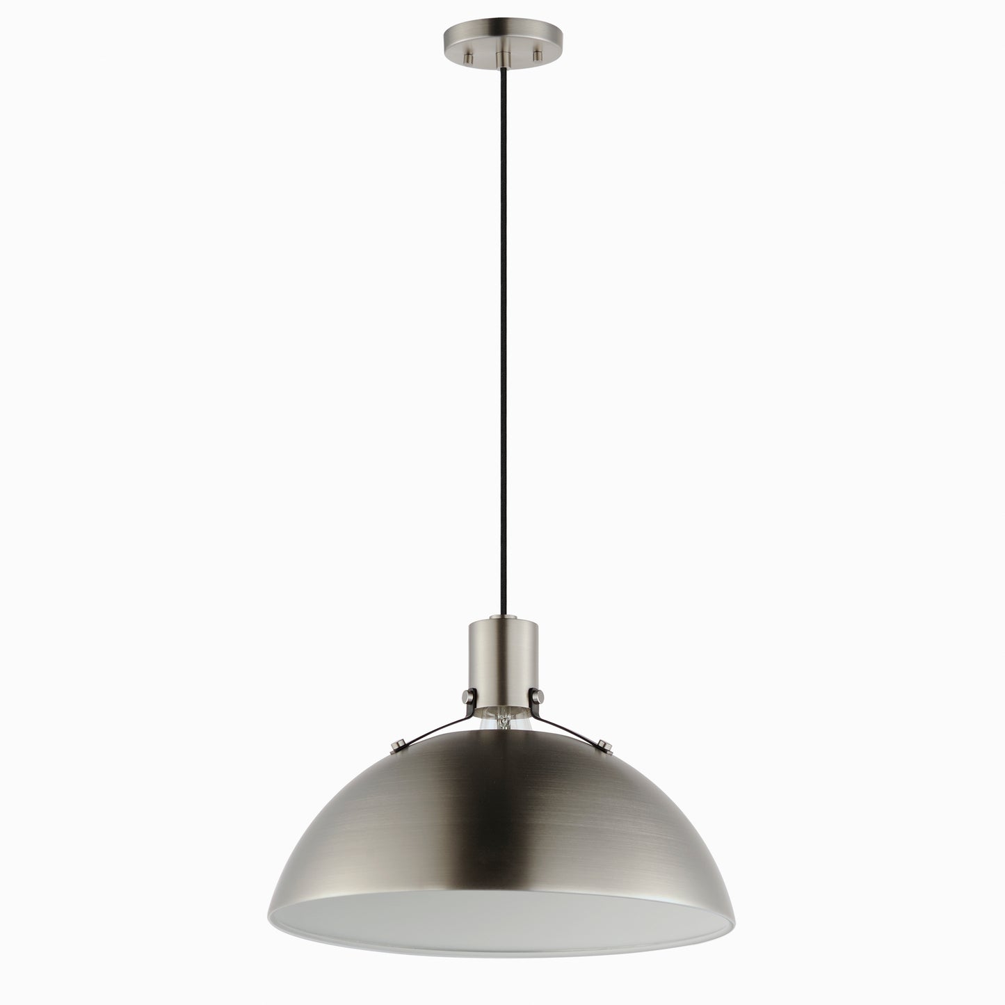 Sockets are suspended above a metal spun dome in your choice of Black or White with Gold accents or Satin Nickel with Black accents. A clean and simple approach to modern or transitional lighting, the opening allows light to shine through the opening atop while providing functional light below. This break in the two parts is supported with straps and decorative rivets in complimentary finishes for a subtlety tasteful two-tone finish. A coordinating pin-up wall sconce offers a bedside application to this design with integrated switch on its back plate and two feet of cord cover that can be removed and hardwired per your preference.