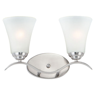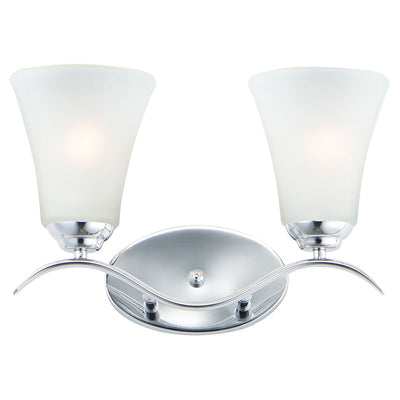 Gently waving arms of Satin Nickel or Oil Rubbed Bronze support tall-profile Frosted glass shades creating a scale normally not found in this category of lighting. The bath vanity may be installed up or down and also includes a Polished Chrome finish.