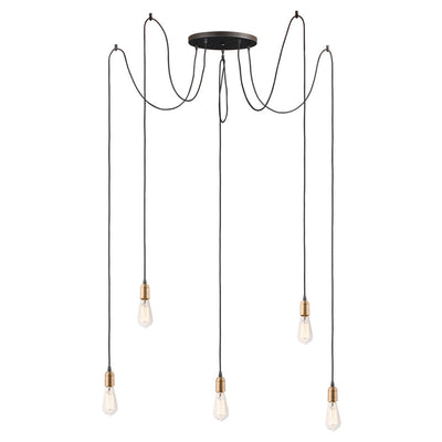 Cords of Black fabric support metal sockets finished in a natural Antique Brass allow you to create unique and fun lighting. All except the single pendant are supplied with hangers that attach to the ceiling to allow you to swag each socket. There are a number of optional bulbs to choose from.