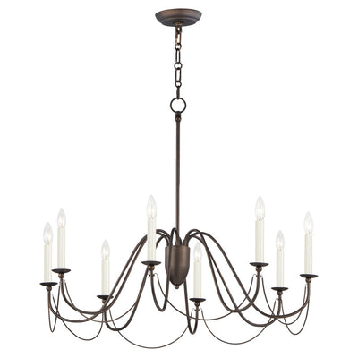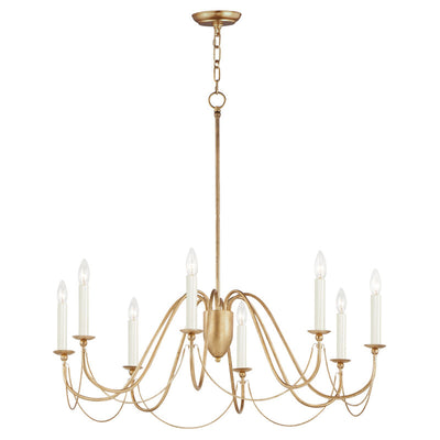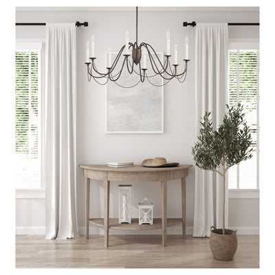 Sweeping metal accents links create classic curves on a minimalist chandelier. Available in hand-rubbed Chestnut Bronze or elegant Gold Leaf finishes. This look humbly evokes French Country charm and enchants any room it illuminates.